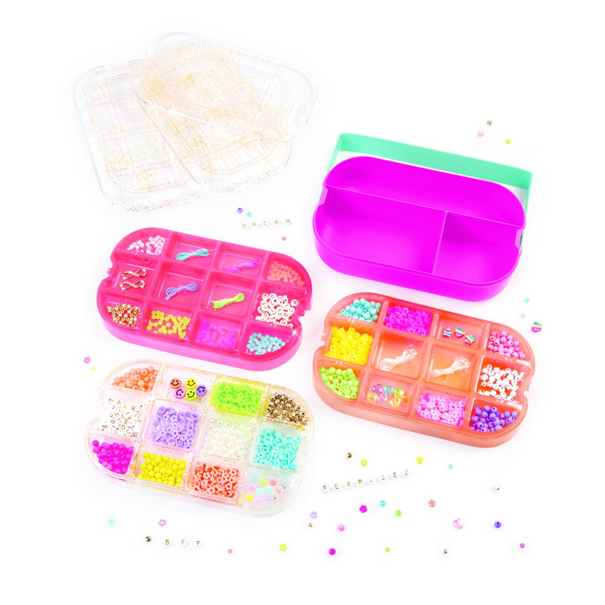 Zahvaljujući praktičnoj ručki, djeca mogu lako ponijeti set sa sobom na druženja ili ga koristiti gdje god ih inspiracija ponese! Set uključuje sve što je potrebno za mlade dizajnere nakita da odmah započnu s kreiranjem – od elastičnih i najlonskih konaca do čak 1370 modernih perlica.