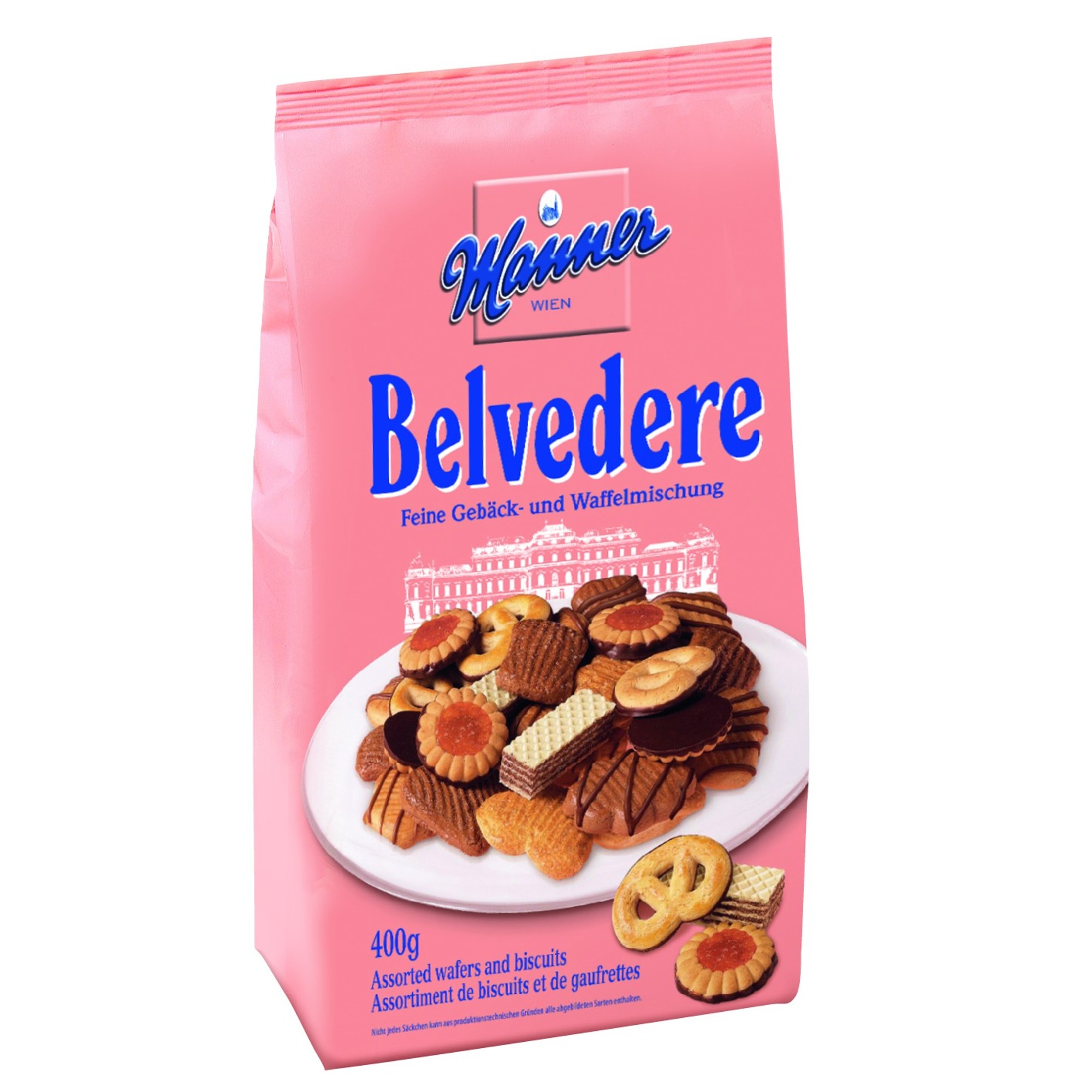Popularna mješavina kolačića sastoji se od ukusne selekcije Manner keksa, vafla i raznih peciva, poput keksa s marmeladom i čokoladom (sa ili bez šećera), pereca i napolitanki, dočaravajući dugu paletu okusa za svakoga! Belvedere mješavina keksa dostupna je u prigodnoj vrećici (400 g).