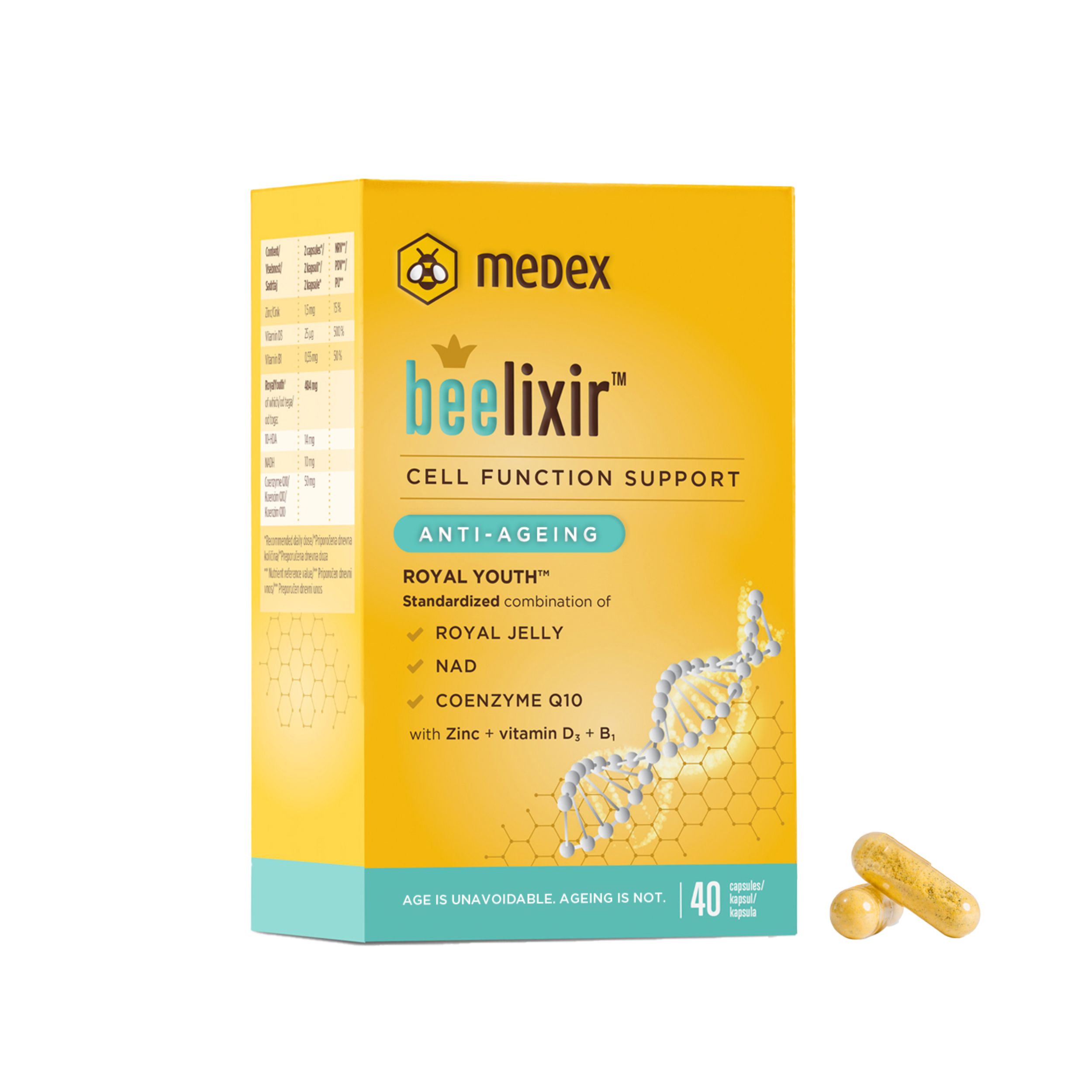 Medex Beelixir predstavlja revolucionarno rješenje za podršku na staničnoj razini, dizajnirano s ciljem usporavanja biološkog starenja. S jedinstvenom formulom Royal Youth™, koja obuhvaća matičnu mliječ, NAD, Q10, te vitamine D i B1, uz dodatak cinka, proizvod potiče obnovu stanica i vitalnost.