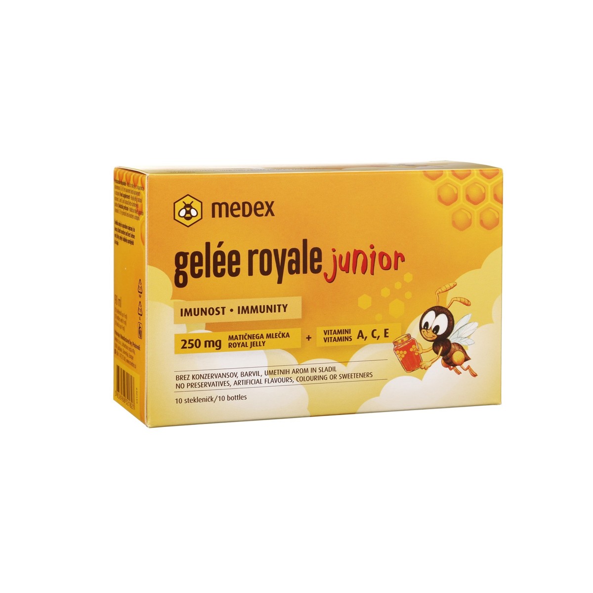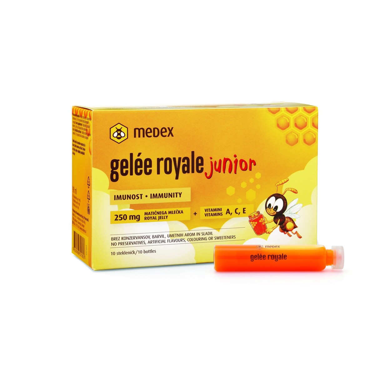 Matična mliječ s prirodnim vitaminima više je od samo prirodnog štita imunološkog sustava djece. Djeca su oduševljena okusom, a roditelji njenom učinkovitom preventivnom zaštitom. Uz zaštitu nudi i više energije i pridonosi boljoj koncentraciji djece. Proizvod Gelée royale junior Medex je razvio posebno za djecu. Sadrži 250 mg matične mliječi u jednoj bočici, prirodne vitamine C i E te prirodni beta karoten. Vitamini su pažljivo izabrani i prilagođeni potrebama djece. Vitamin C doprinosi normalnoj funkciji imunološkog sustava i smanjenju umora i iscrpljenosti, vitamin E doprinosi zaštiti stanica od oksidativnog stresa (djeluju kao antioksidant), vitamin A doprinosi normalnoj funkciji imunološkog sustava te u očuvanju vida. Gelée royale junior slasnog je okusa, a zbog jake narančaste boje, koja je posljedica sadržaja prirodnog beta karotena, privlačan je i na pogled.Izbirljivost djece odsada neće više bit razlog za uzimanje proizvoda punih bojila i umjetnih aroma, jer djeca Gelée royale junior obožavaju. Ponudite im ga prije punovrijednog doručka, kao nagradu za pravovremeno ustajanje ili skupa s njima »nazdravite« novom danu i pri tome za sebe odaberite jedan od proizvoda Gelée royale za odrasle. Proizvod je u bočicama koje su sigurne i jednostavne za uporabu, a istovremeno čuvaju i osiguravaju kvalitetu sastojaka proizvoda.