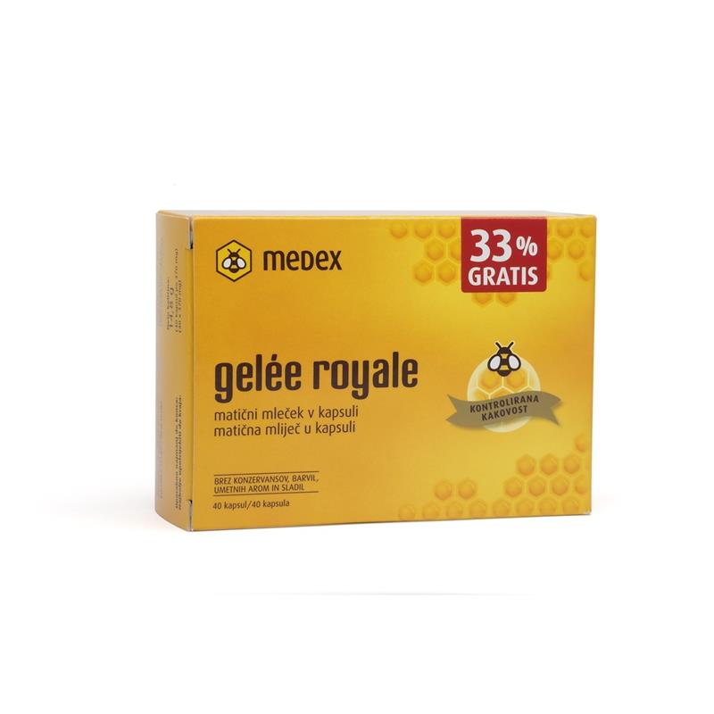 Kapsule Gelée royale su dodatak prehrani s 350 mg matične mliječi u jednoj kapsuli. Liofiliziran (dehidriran) oblik matične mliječi čuva sve njezine prirodne djelatne tvari i odlična je dopuna svakodnevnoj prehrani. Preporučujemo ih svima koji su izloženi većoj tjelesnoj aktivnosti i drugim naporima.