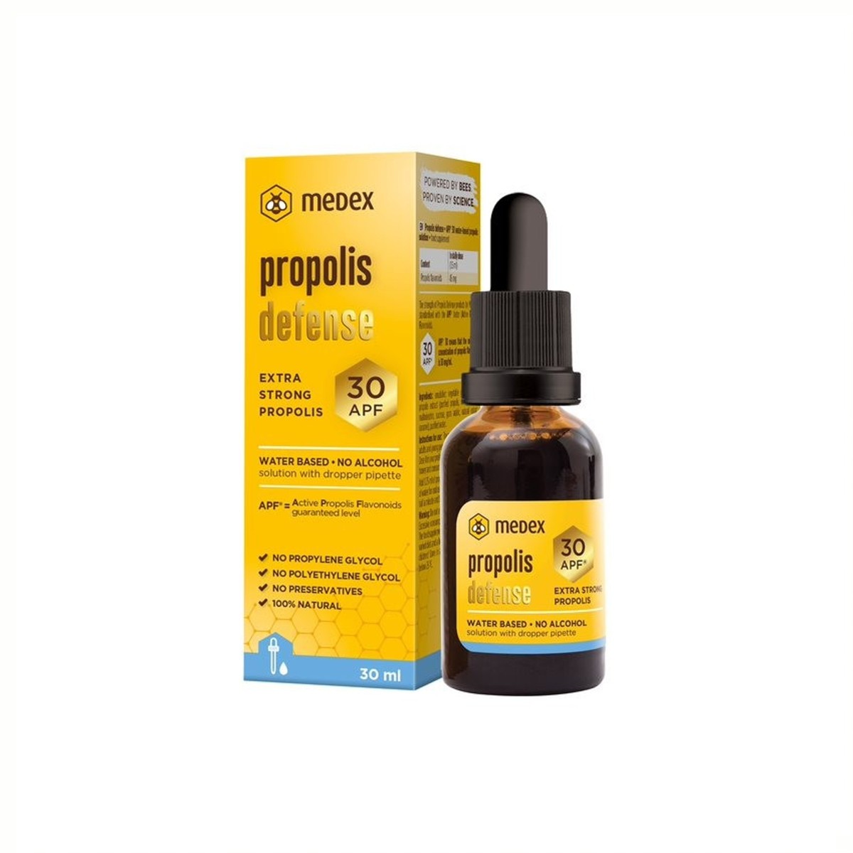 Medex Propolis Defense APF 30 na vodenoj osnovi s kapaljkom je bezalkoholni tekući dodatak prehrani s flavonoidima iz propolisa. Propolis na bazi vode, ali sa snagom klasičnog alkoholnog propolisa. Za ublažavanje upale grla i ždrijela, za zaštitu usne sluznice, zuba i desni. Ne boji zube, ne sadrži alkohol, a pogodan je i za trudnice, dojilje i djecu stariju od 12. godine. 100% prirodan, bez konzervansa, bez polietilen glikola i propilen glikola. Jedno pakiranje je dovoljno za 20 dana.
