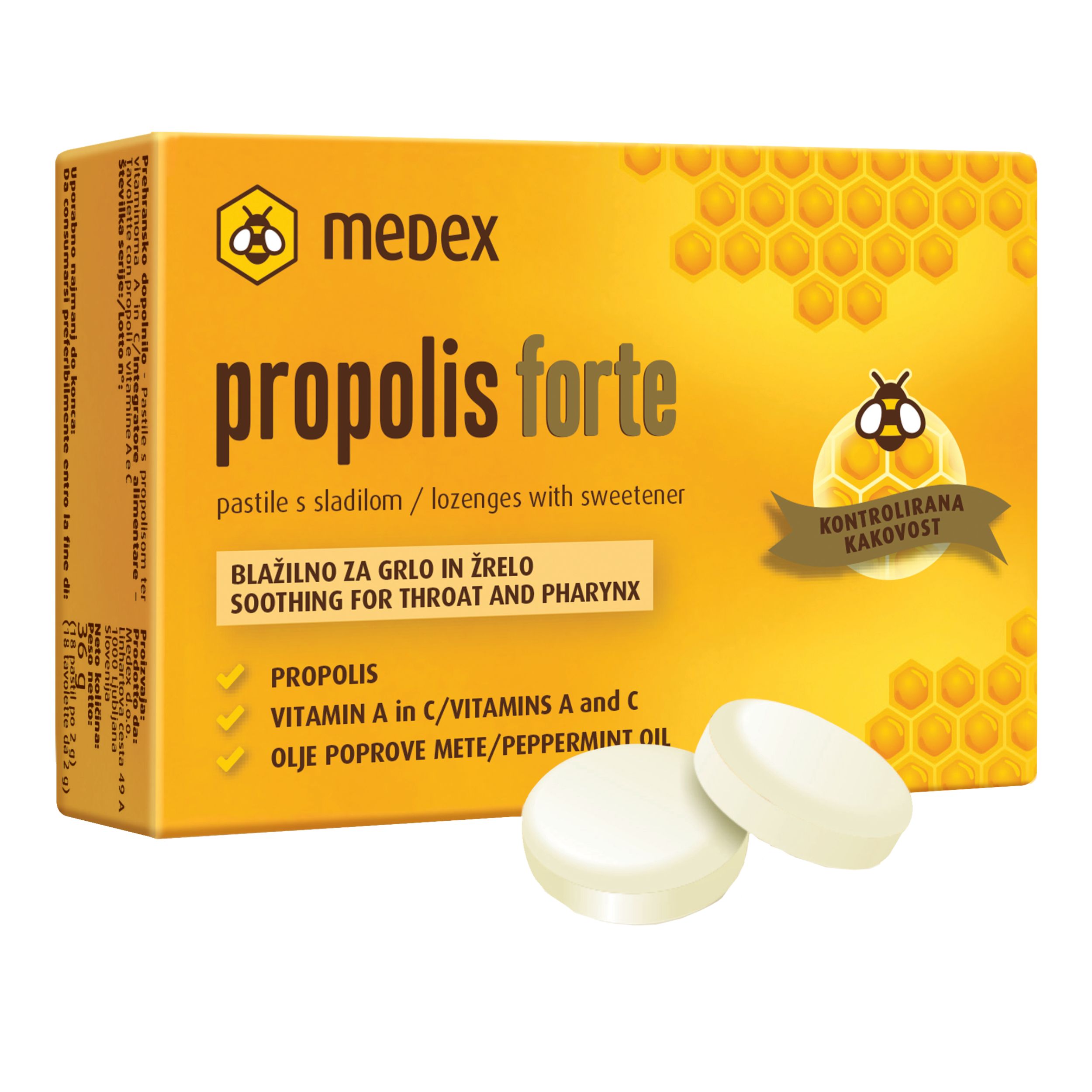 Propolis forte pastile s propolisom, vitaminima A i C te uljem paprene metvice. Dodatak prehrani. Vitamin A i vitamin C doprinose normalnoj funkciji imunološkog sustava. Vitamin A doprinosi održavanju normalnih sluznica. Propolis pastile ublažavaju tegobe u grlu i ždrijelu. Prikladni su i za djecu i za odrasle.
