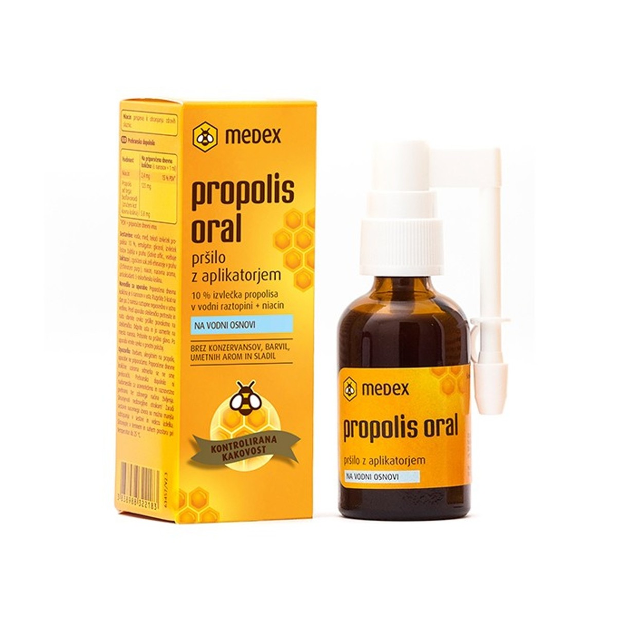 Proizvod osim propolisa na vodenoj osnovi sadrži i med, ehinaceju, niacin koji doprinosi ozdržavanju normalnih sluznice. i suhi ekstrakt lišća kadulje. U proizvodu smo standardizirali ključne sastojke propolisa, bioflavonoide, koji biljke štite od mikroorganizama, i time osigurali njegovu stalnu kvalitetu.
