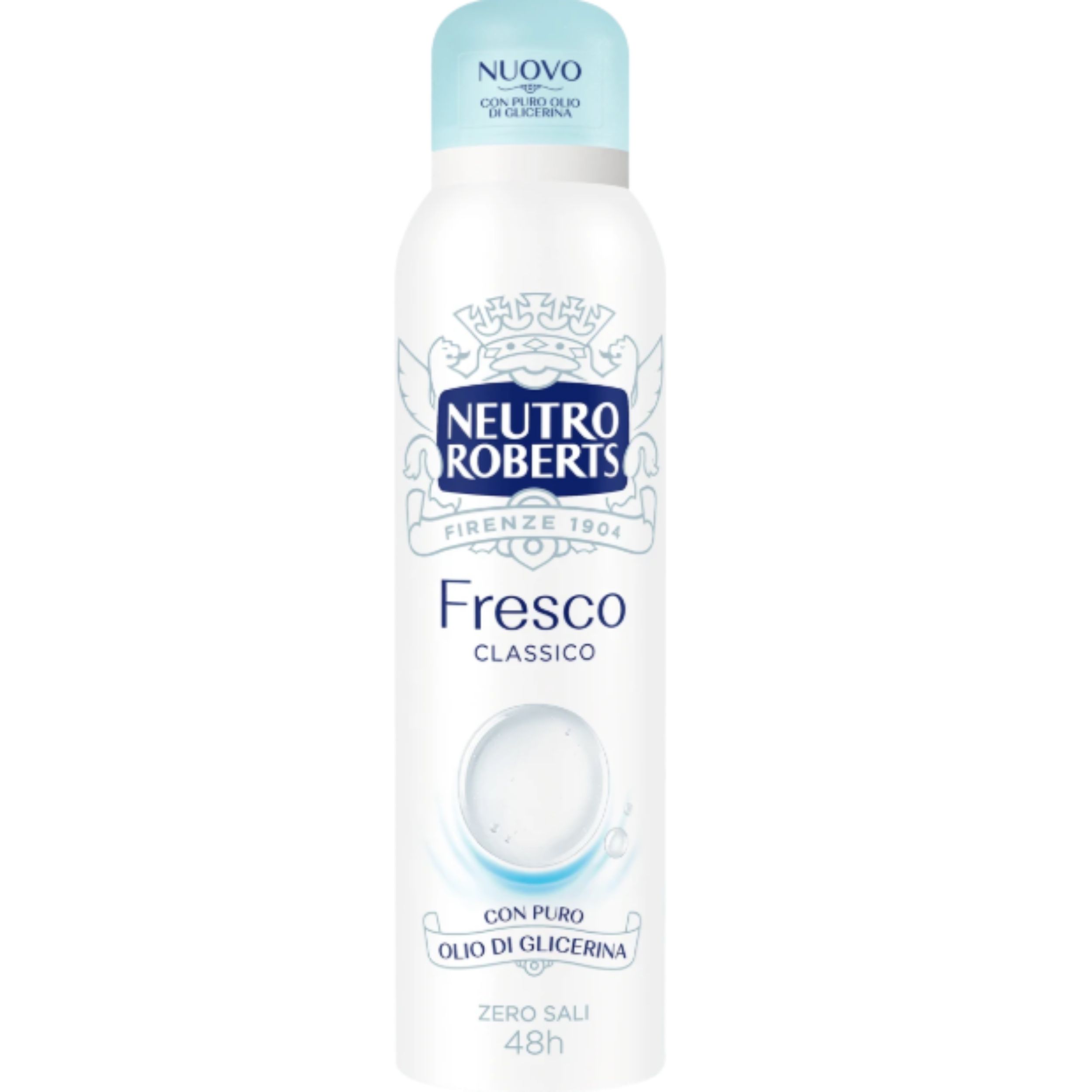 Neutro Roberts Fresco Classic dezodorans u spreju s novom, posebno osmišljenom, formulom s glicerinskim uljem istovremeno štiti od znoja do 48 sati te vraća prirodnu hidrataciju vašoj koži. Njegov spoj tradicionalnih nota zumbula, modernog geranija i kremastog jasmina ostavlja nježan bezvremenski miris na vašoj koži. Neutro Roberts Fresco Classic dezodorans u spreju ne ostavlja tragove na odjeći i ne sadrži aluminijeve soli.