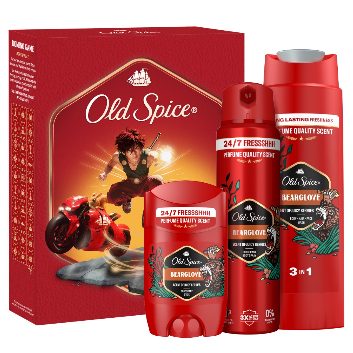 Oslobodi nevjerojatnu 24-satnu svježinu 7 dana u tjednu* uz darovne komplete Old Spice! Tražiš savršen dar za obožavatelja animea koji strastveno prenosi duh svojih omiljenih likova i legendarno miriše? Ne traži dalje! Darovni komplet sadrži dezodorans u stiku, dezodorans u spreju i gel za tuširanje za muškarce Bearglove, prekrasno upakirane u kartonskoj kutiji s dizajnom Anime. Uključuje i uradi-sam domino: dijelovi se jednostavno izrežu iz kutije za uživanje u fantamirisnom trenutku! Ne možeš pogriješiti s mirisom parfemske kvalitete Old Spice Bearglove: uz miris sočnog bobičastog voća, pikantnih citrusa i hrskave jabuke s daškom začina postat će najneodoljiviji stvor u šumi. Kako to da ovaj darovni komplet Old Spice nije već u tvojoj košarici? (*kada se koriste gel za tuširanje i dezodorans)