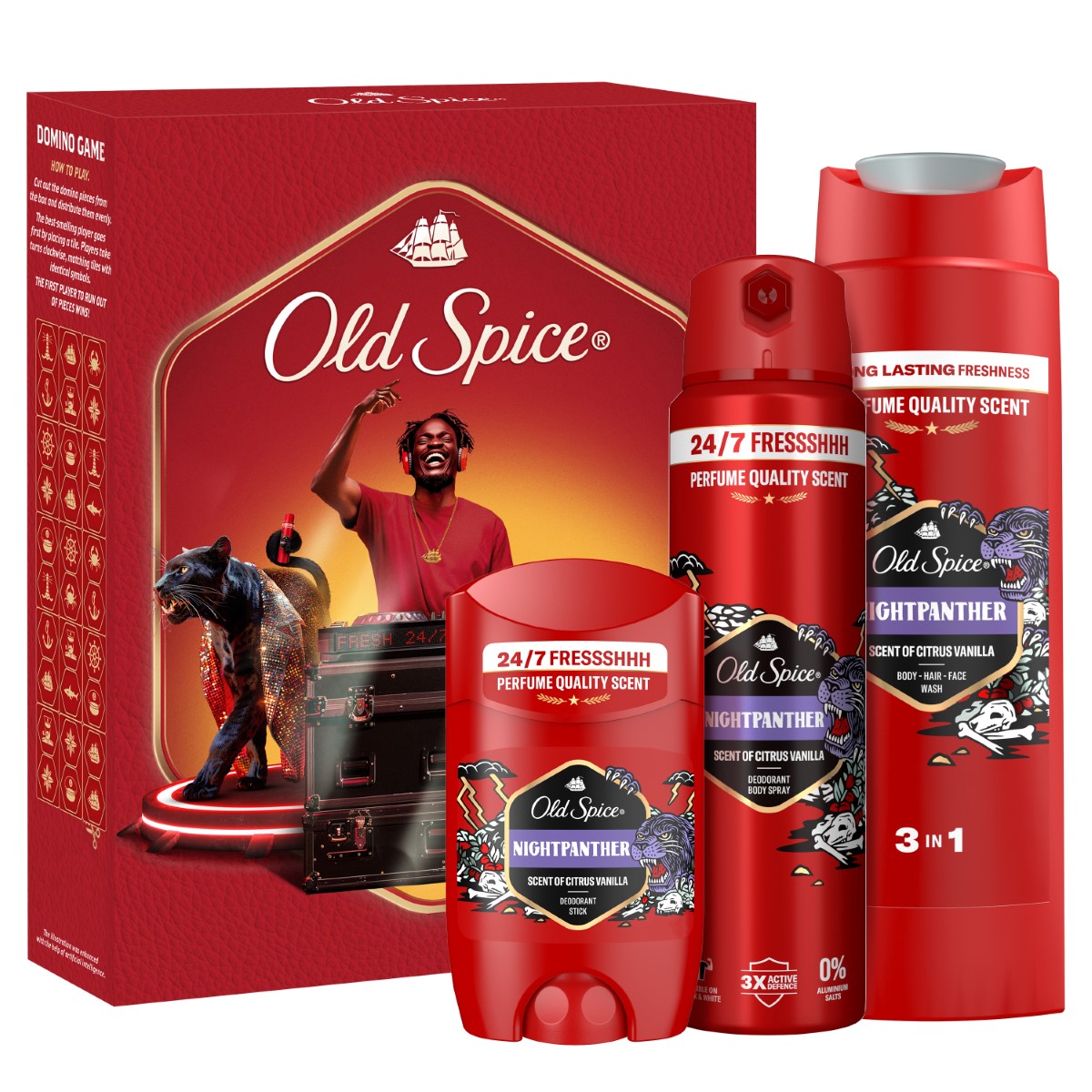 Oslobodi nevjerojatnu 24-satnu svježinu 7 dana u tjednu* uz darovne komplete Old Spice! Tražiš savršen dar za ljubitelja partyja koji se zabavlja dan i noć, opušten je i legendarno miriše? Ne traži dalje! Darovni komplet sadrži dezodorans u stiku, dezodorans u spreju i gel za tuširanje za muškarce Night Panther, prekrasno upakirane u kartonskoj kutiji s dizajnom DJ. Uključuje i uradi-sam domino: dijelovi se jednostavno izrežu iz kutije za uživanje u fantamirisnom trenutku! Ne možeš pogriješiti s mirisom parfemske kvalitete Old Spice Night Panther: bogati miris tamne čokolade, ljutkastih citrusa i vanilije stvara opasnu ovisnost. Kako to da ovaj darovni komplet Old Spice nije već u tvojoj košarici? (*kada se koriste gel za tuširanje i dezodorans)