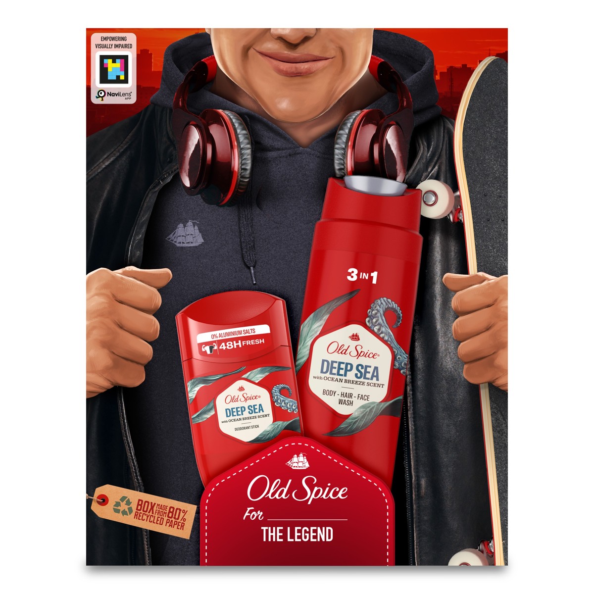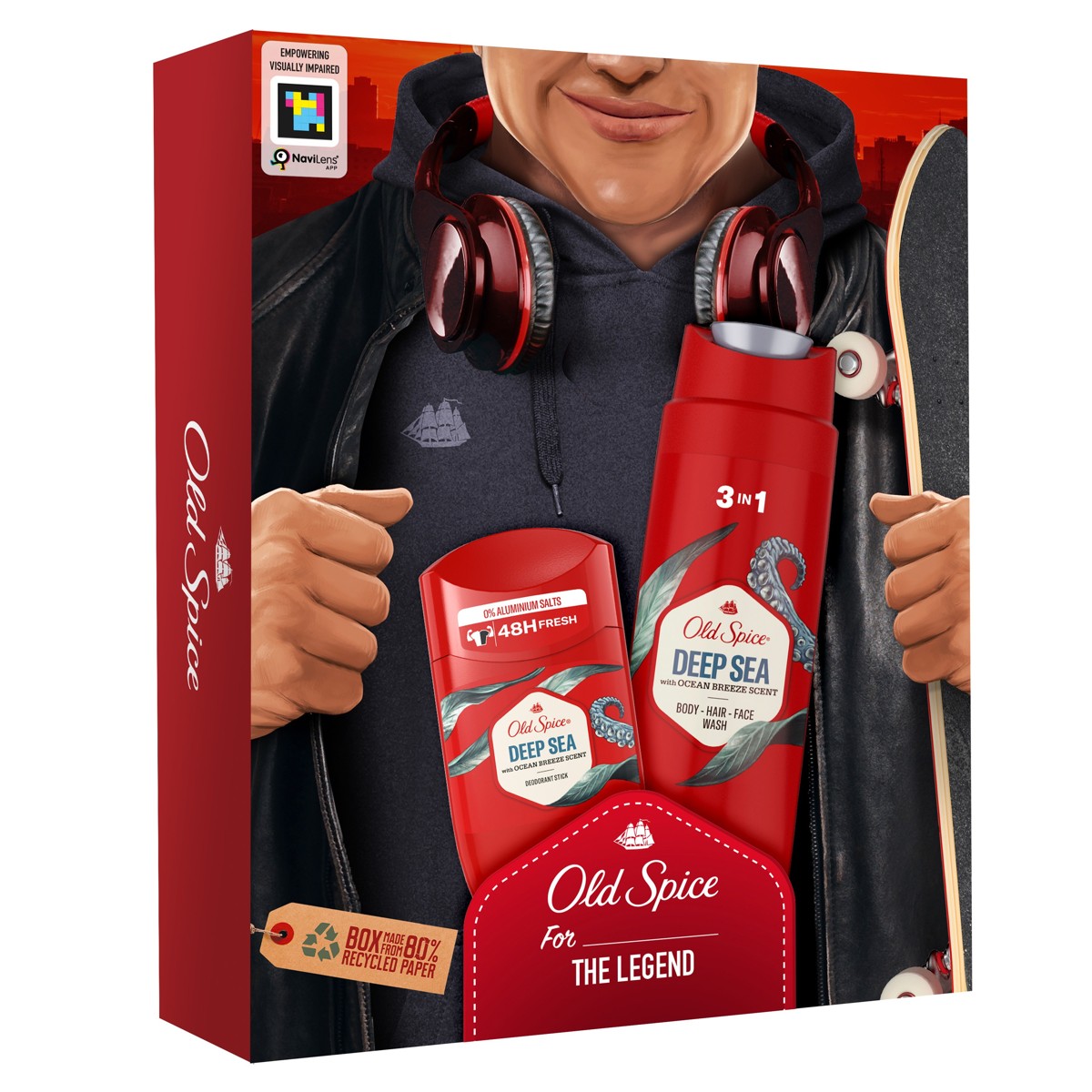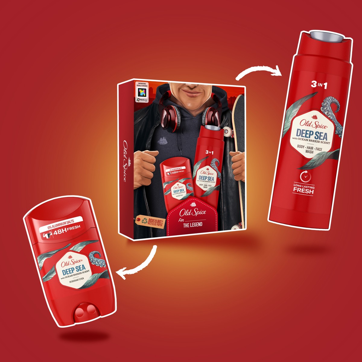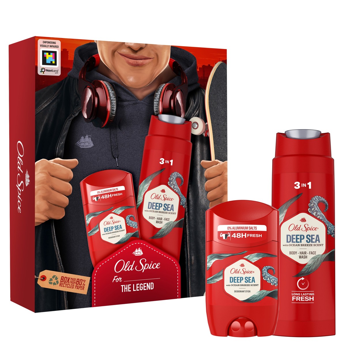 Tražite li savršen poklon za njega, darovni kompleti Old Spice pravo su rješenje. Darovni kompleti za muškarce Old Spice najbolji su izbor kada želite zadiviti modernog muškarca jer je jednostavno nemoguće pogriješiti s neodoljivim muževnim mirisima Old Spice. Darovni komplet Footballer Old Spice s toaletnom torbicom sadrži dezodorans u stiku Captain i gel za tuširanje za muškarce Captain te dezodorans u stiku Deep Sea i gel za tuširanje za muškarce Deep Sea, sve u prepoznatljivoj toaletnoj torbici Old Spice. Donosi miris Captain, naš najbolje ocijenjeni miris (istraživanje mirisa najvećih konkurenata u kojem je sudjelovao 121 muškarac, a provedeno je 2021. u Ujedinjenom Kraljevstvu) s vodenim i citrusnim notama te miris Deep Sea Fresh Ocean. Jednostavno ne možete pogriješiti s ovom kombinacijom. Naposljetku, omot darovnog kompleta izrađen je od 80% recikliranog papira i materijala iz odgovornih izvora s certifikatom FSC. Kako to da ovaj darovni komplet Old Spice za muškarce nije već u vašoj košarici?