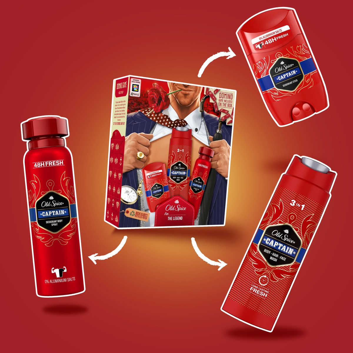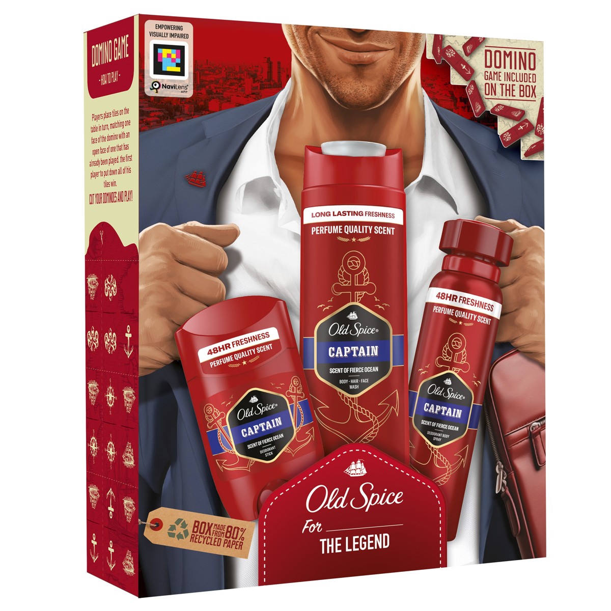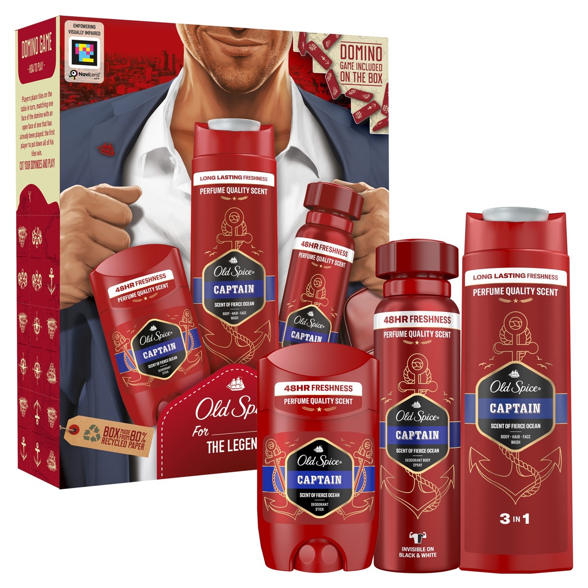 Tražite li savršen poklon za njega, darovni kompleti Old Spice pravo su rješenje. Darovni kompleti za muškarce Old Spice najbolji su izbor kada želite zadiviti modernog muškarca jer je jednostavno nemoguće pogriješiti s neodoljivim muževnim mirisima Old Spice. Darovni komplet Old Spice Gentleman sadrži dezodorans u stiku Captain, dezodorans u spreju Captain i gel za tuširanje za muškarce Captain. Proizvodi dolaze u kartonskoj kutiji s dizajnom Gentleman koja uključuje uradi-sam domino. Samo izrežite domino pločice sa strana kutije i uživajte u fantastičnoj igri. Ovaj darovni komplet donosi miris za muškarce Captain s vodenim i citrusnim notama, naš najbolje ocijenjeni miris (istraživanje mirisa najvećih konkurenata u kojem je sudjelovao 121 muškarac, a provedeno je 2021. u Ujedinjenom Kraljevstvu). S njime jednostavno ne možete pogriješiti. Naposljetku, omot darovnog kompleta izrađen je od 80% recikliranog papira i materijala iz odgovornih izvora s certifikatom FSC. Kako to da ovaj darovni komplet Old Spice nije već u vašoj košarici?