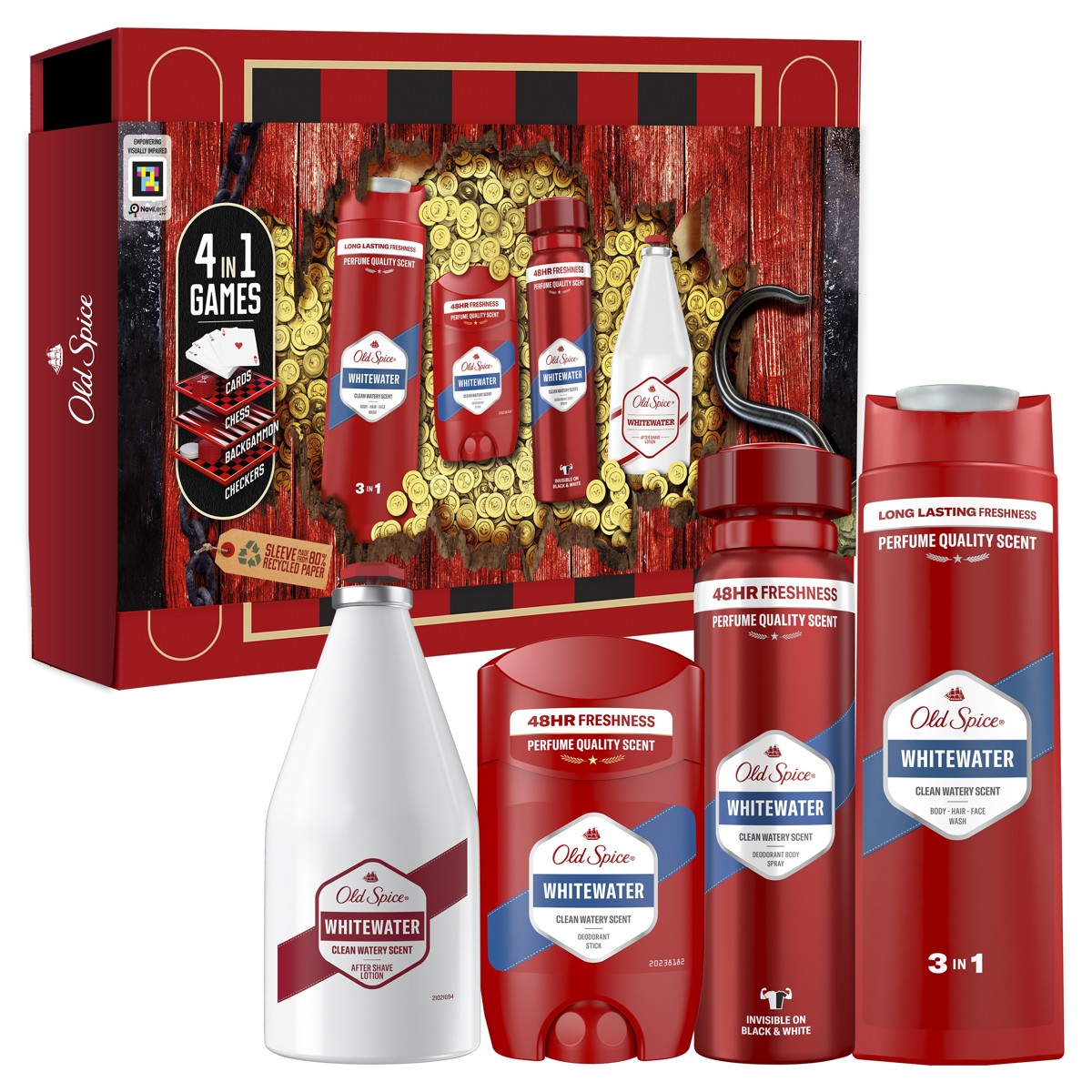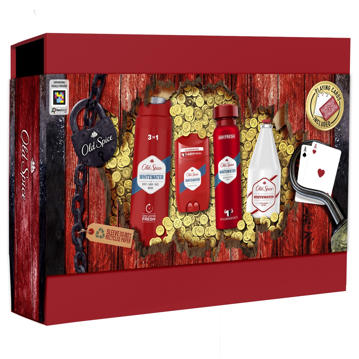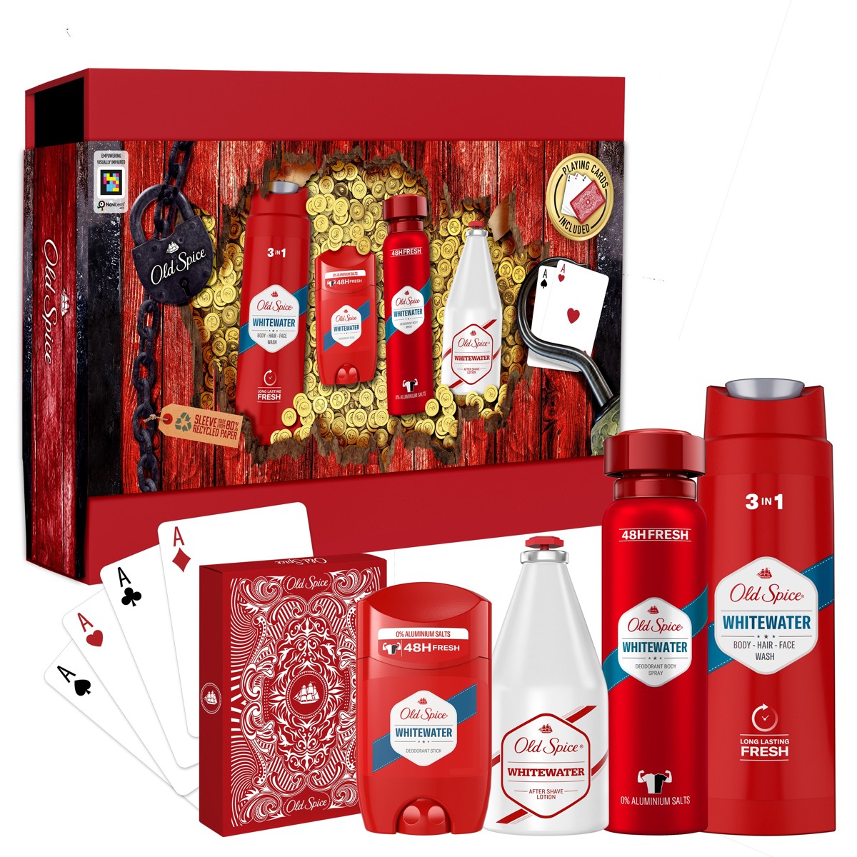 Poklon paket sadrži dezodorans u stiku Whitewater, dezodorans u spreju Whitewater, gel za tuširanje Whitewater i losion za njegu nakon brijanja Whitewater, te legendarne igraće karte Old Spice