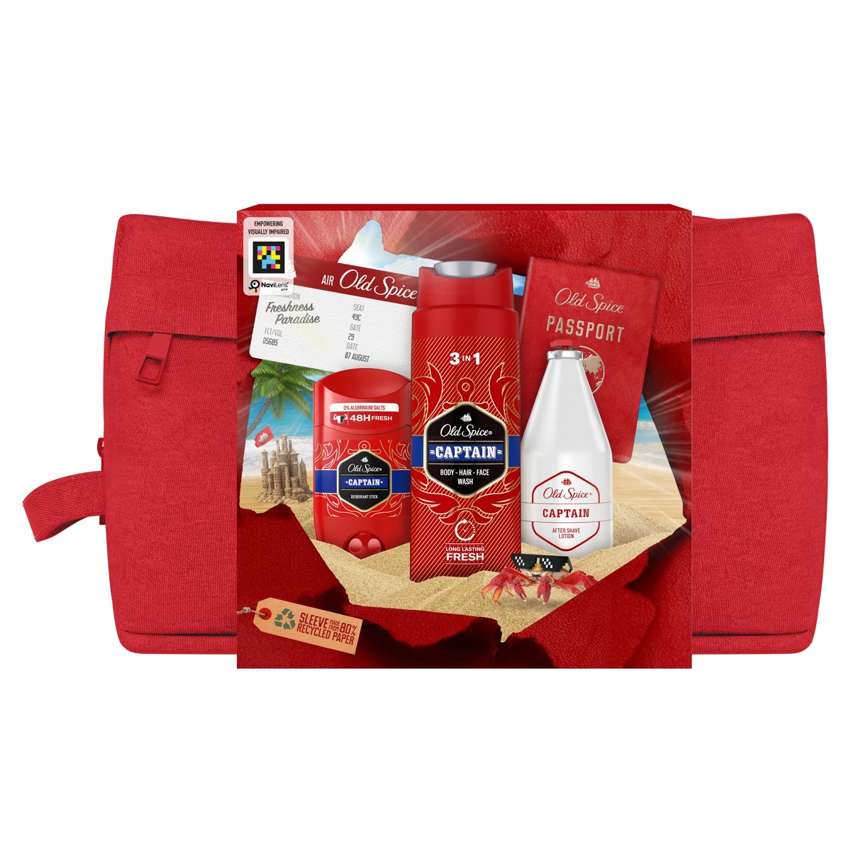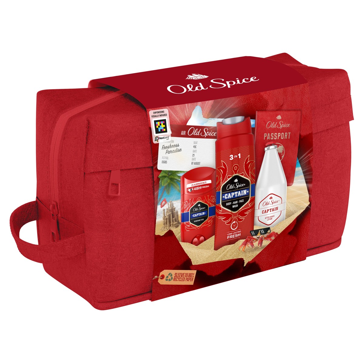 Poklon paket s toaletnom torbicom sadrži dezodorans u stiku Captain, gel za tuširanje Captain i losion za njegu nakon brijanja Captain