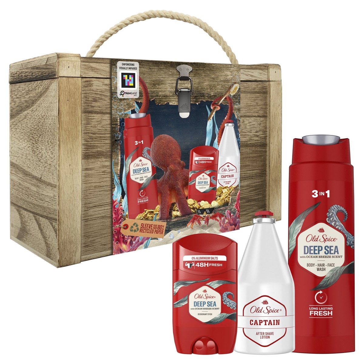 Poklon paket sadrži dezodorans u stiku Deep Sea, gel za tuširanje za muškarce Deep Sea i losion za njegu nakon brijanja Captain, sve u prepoznatljivoj drvenoj škrinjici s blagom Old Spice