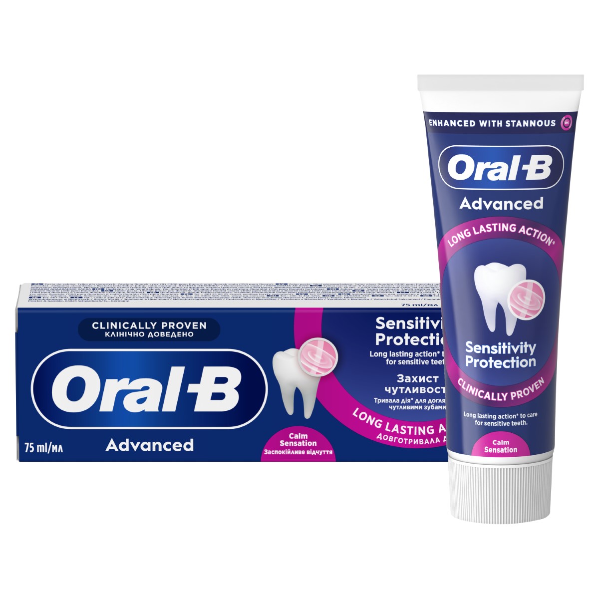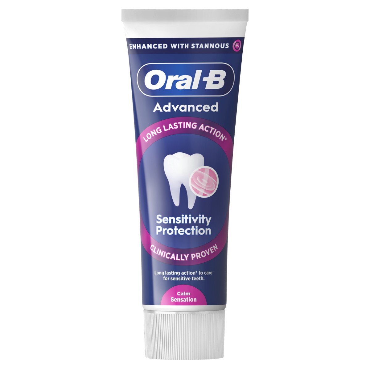 Zubna pasta Oral-B Advanced Sensitivity Protection Calm Sensation klinički dokazano pruža dugotrajnu zaštitu osjetljivih zubi s kontinuiranom upotrebom. Jedinstvena antibakterijska tehnologija marke Oral-B s kositrenim fluoridom i aktivnim umirujućim sastojcima stvara zaštitni sloj koji učinkovito štiti osjetljive zube čak i između pranja te pruža osjećaj svježine tijekom i nakon pranja zubi. Prikladno za osjetljive zube. Zubna pasta za svakodnevnu upotrebu.
