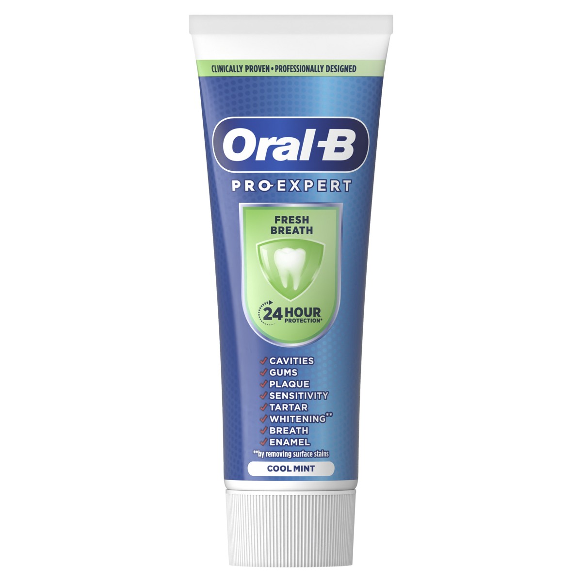 Zubna pasta Oral-B Pro Expert Fresh Breath klinički je dokazana i osmišljena u stručnoj suradnji sa stomatolozima. Ova zubna pasta osvježava dah i pruža 24-satnu zaštitu od zubnih naslaga kada perete zube dvaput dnevno.