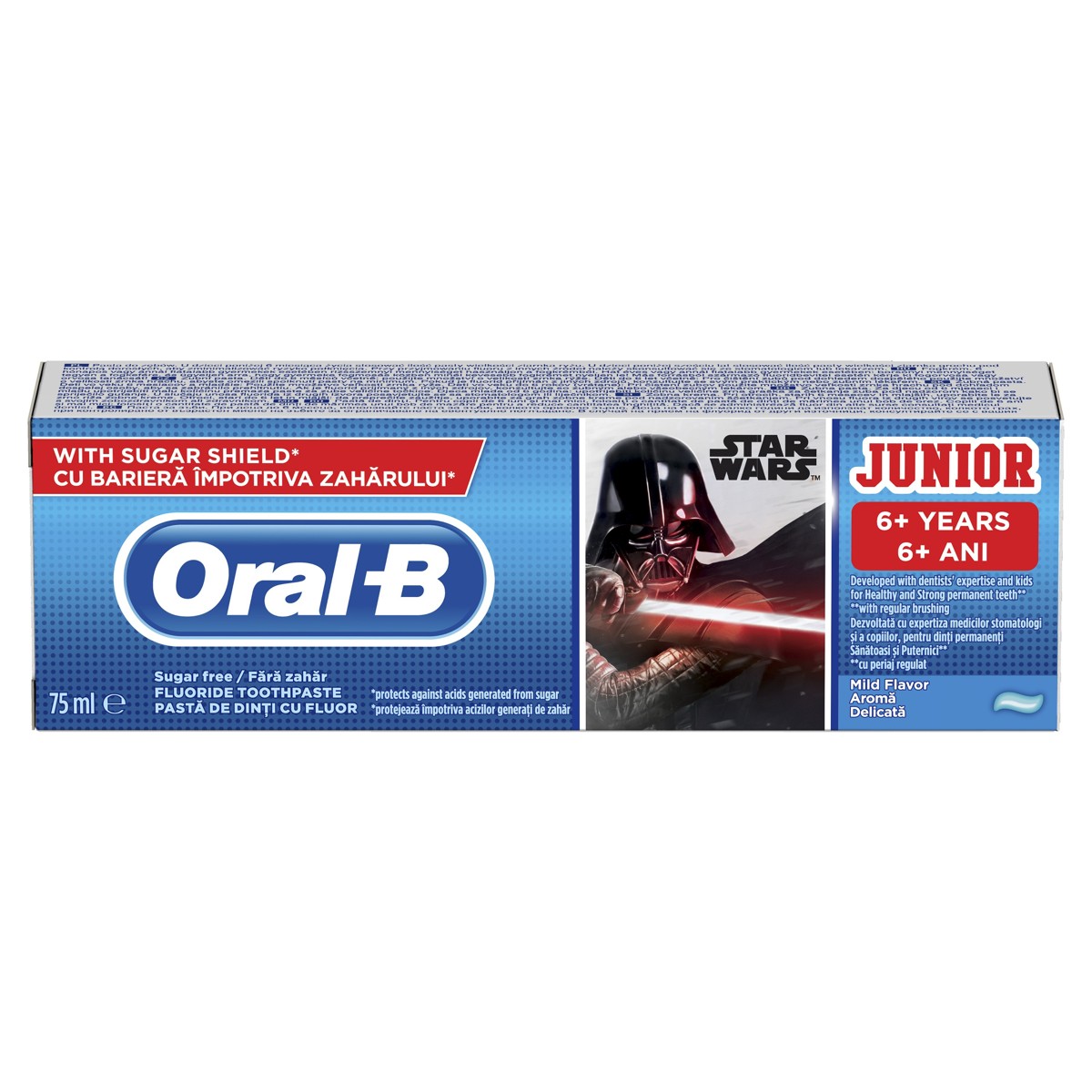 Zubna pasta Oral-B Junior s likovima iz filma ‘Ratovi zvijezda’ osmišljena je u suradnji sa stomatolozima kako bi djeca mogla preuzeti kontrolu nad zdravljem svoje usne šupljine. Štiti zube od kiselina iz šećera u svakodnevnoj hrani.