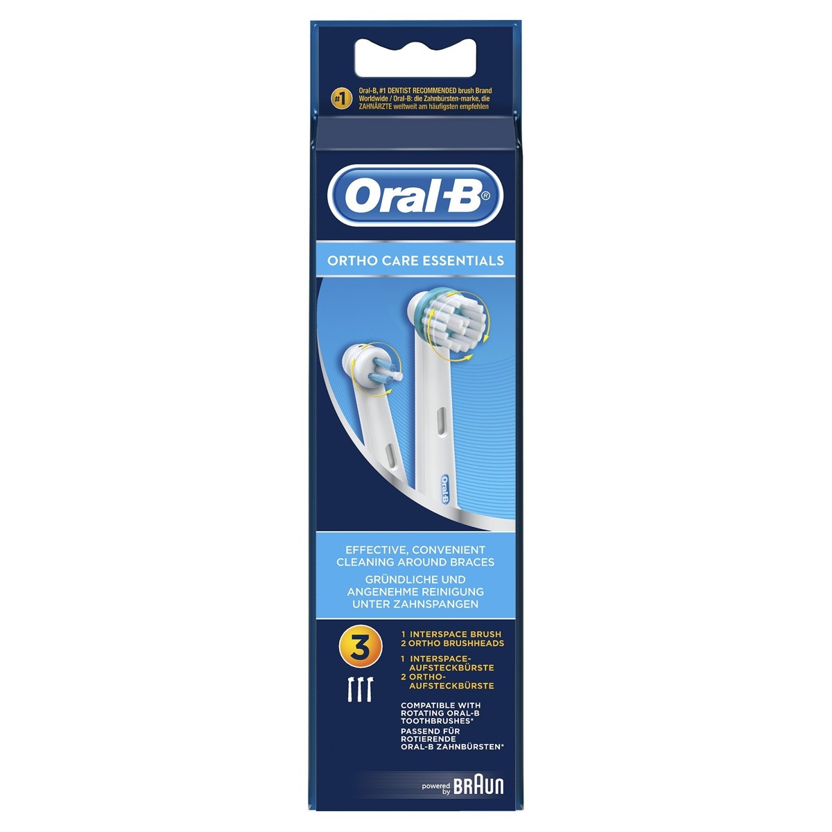 Komplet Oral-B Ortho Care Essentials sadrži 3 zamjenske glave zubne četkice za učinkovito i praktično čišćenje i održavanje ortodontskih zubnih aparatića.