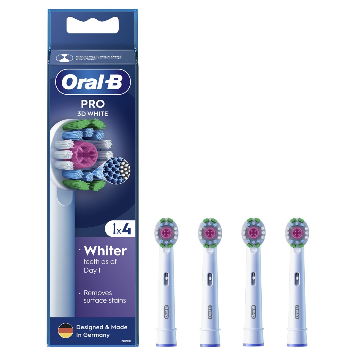 Glava zubne četkice Oral-B Pro 3D White ima jedinstvenu kapicu za poliranje koja izbjeljuje zube već od 1. dana uklanjanjem površinskih mrlja. Originalne glave zubne četkice Oral-B imaju novi raspored vlakana u obliku slova X što im omogućuje da čiste područja do kojih kružno raspoređena vlakna ne mogu dosegnuti. Indikator korištenja glave zubne četkice promjenom boje vlakana iz zelene u žutu boju podsjeća da zamijenite glavu četkice kad za to dođe trenutak, a sve kako biste zadržali 100% učinkovitost čišćenja. Uklanja površinske mrlje, za bjelje zube već od 1. dana. Samo originalne glave zubne četkice Oral-B imaju vlakna u obliku slova X koja čiste područja do kojih obična vlakna ne mogu dosegnuti, za učinkovito čišćenje.