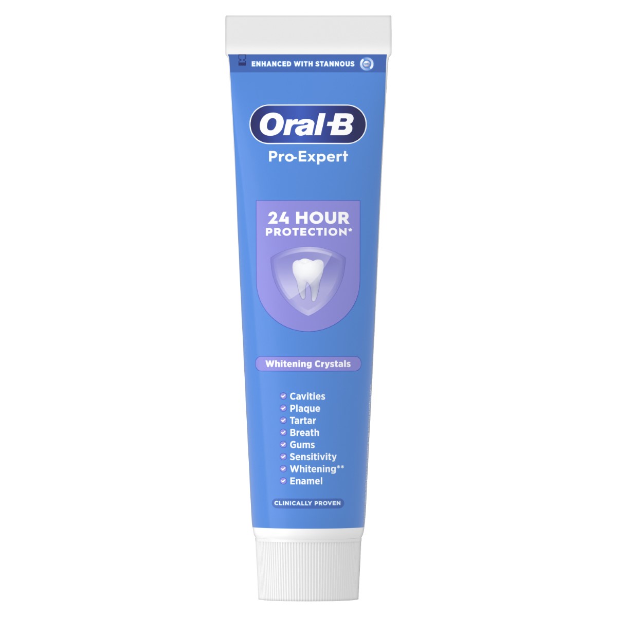 Zubna pasta Oral-B Pro-Expert Gentle Whitening klinički dokazano pruža 24-satnu zaštitu pri upotrebi dvaput dnevno, a antibakterijska tehnologija s kositrenim fluoridom stvara zaštitni sloj koji pomaže smanjiti rast bakterijskih naslaga čak i između pranja zubi. Svjež spoj zelene metvice te slatkih aromatičnih nota i osvježavajućeg mentola pruža osnažujući osjećaj svježine