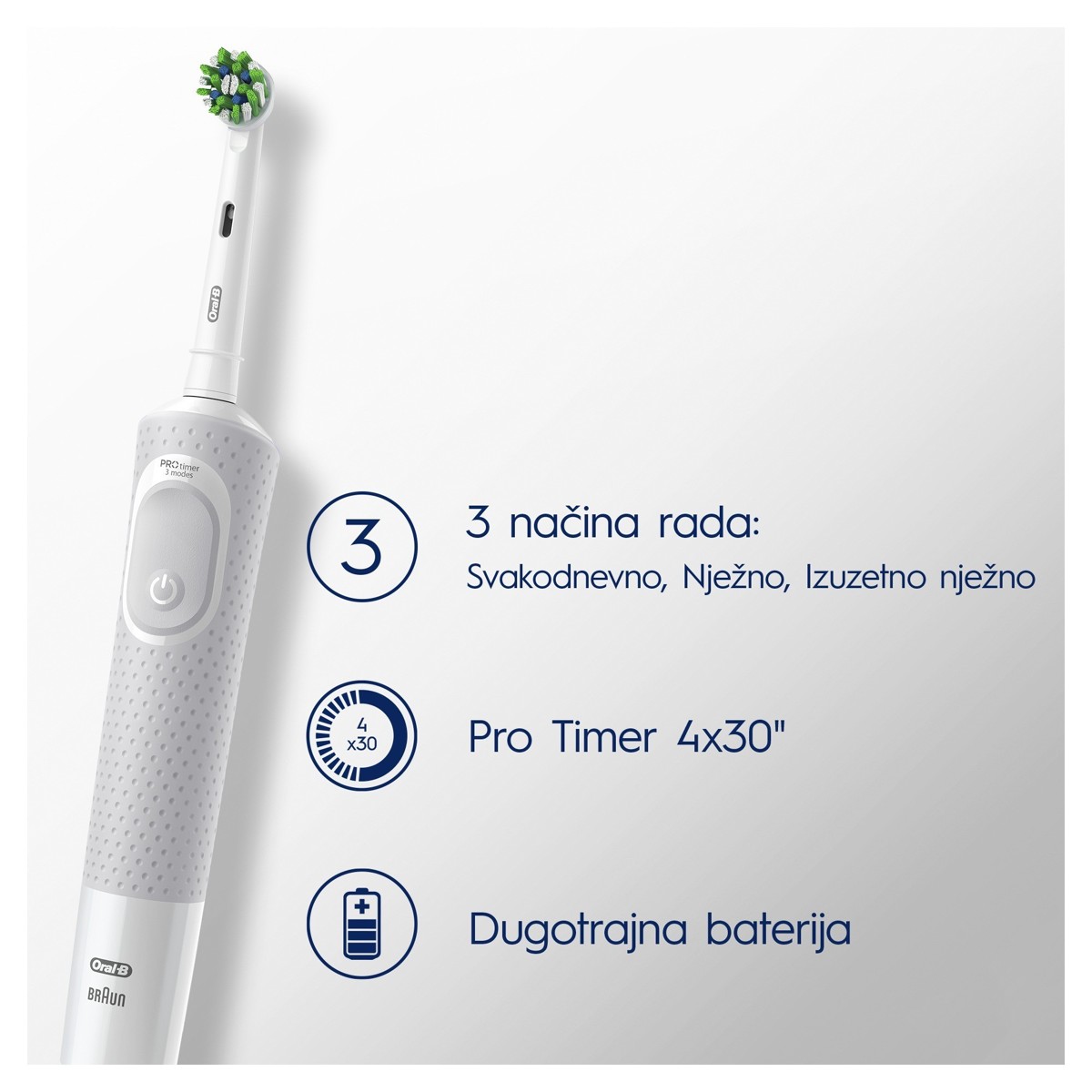 Električna zubna četkica Oral-B Pro pruža klinički dokazano vrhunsko čišćenje u usporedbi s običnom klasičnom zubnom četkicom. Četkica ima 3 načina rada: Daily Clean (svakodnevno čišćenje), Sensitive (nježno) i Sensitive Plus (iznimno nježno) za nevjerojatno nježno iskustvo. Mjerač vremena ugrađen u dršku pomaže da pranje zuba traje 2 minute, u skladu s preporukama stomatologa. I što je najbolje – sve to omogućuje Oral-B, marka zubnih četkica br. 1 koju upotrebljava najviše stomatologa diljem svijeta.