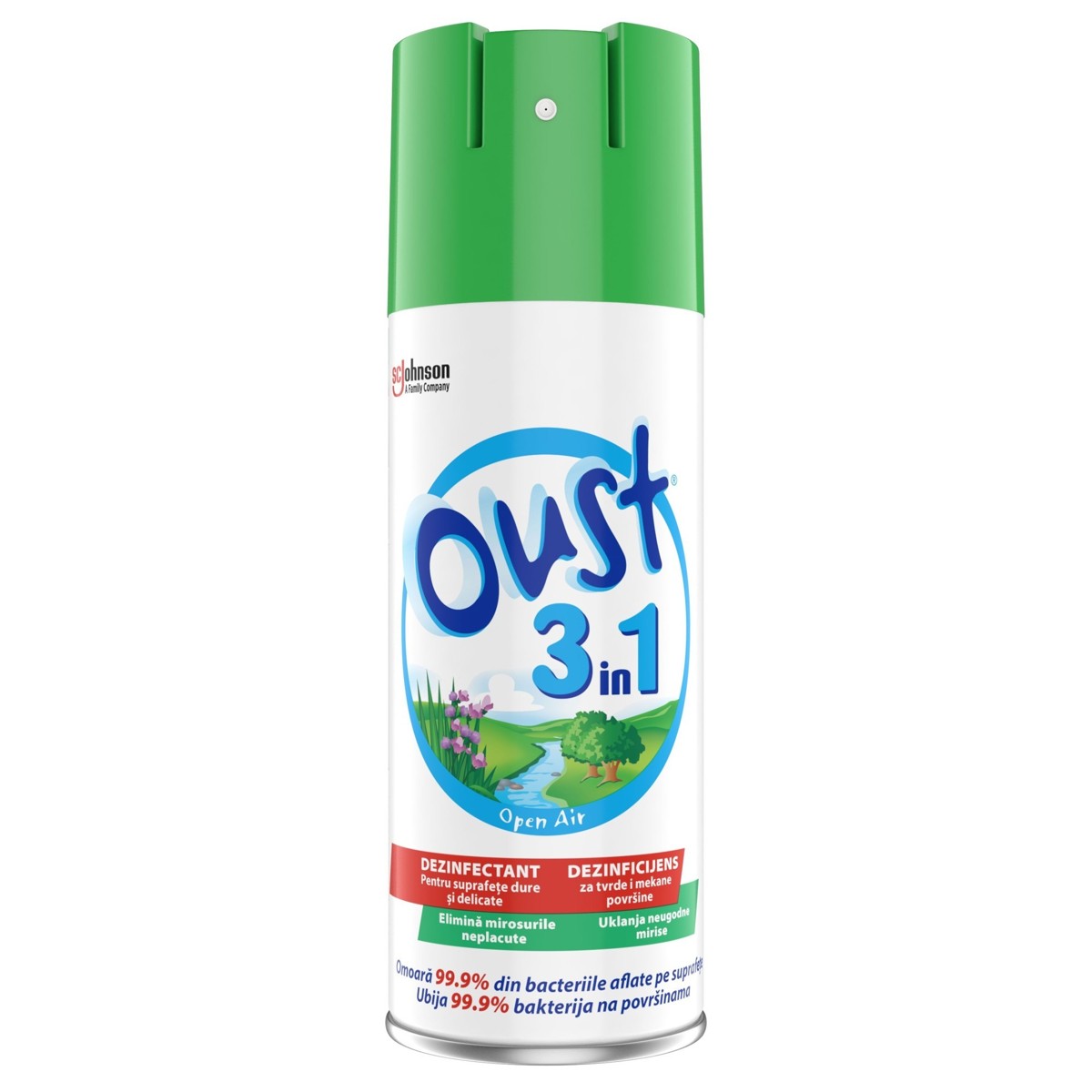 Oust® 3u1 sprej svojom formulom za trostruko djelovanje uklanja neugodne mirise u prostoru, uništava bakterije na tvrdim neporoznim površinama (radne plohe, kante za otpad, toalet, telefonske slušalice, kvake na vratima) i uništava bakterije na mekanim površinama (zavjese, pokrivači).