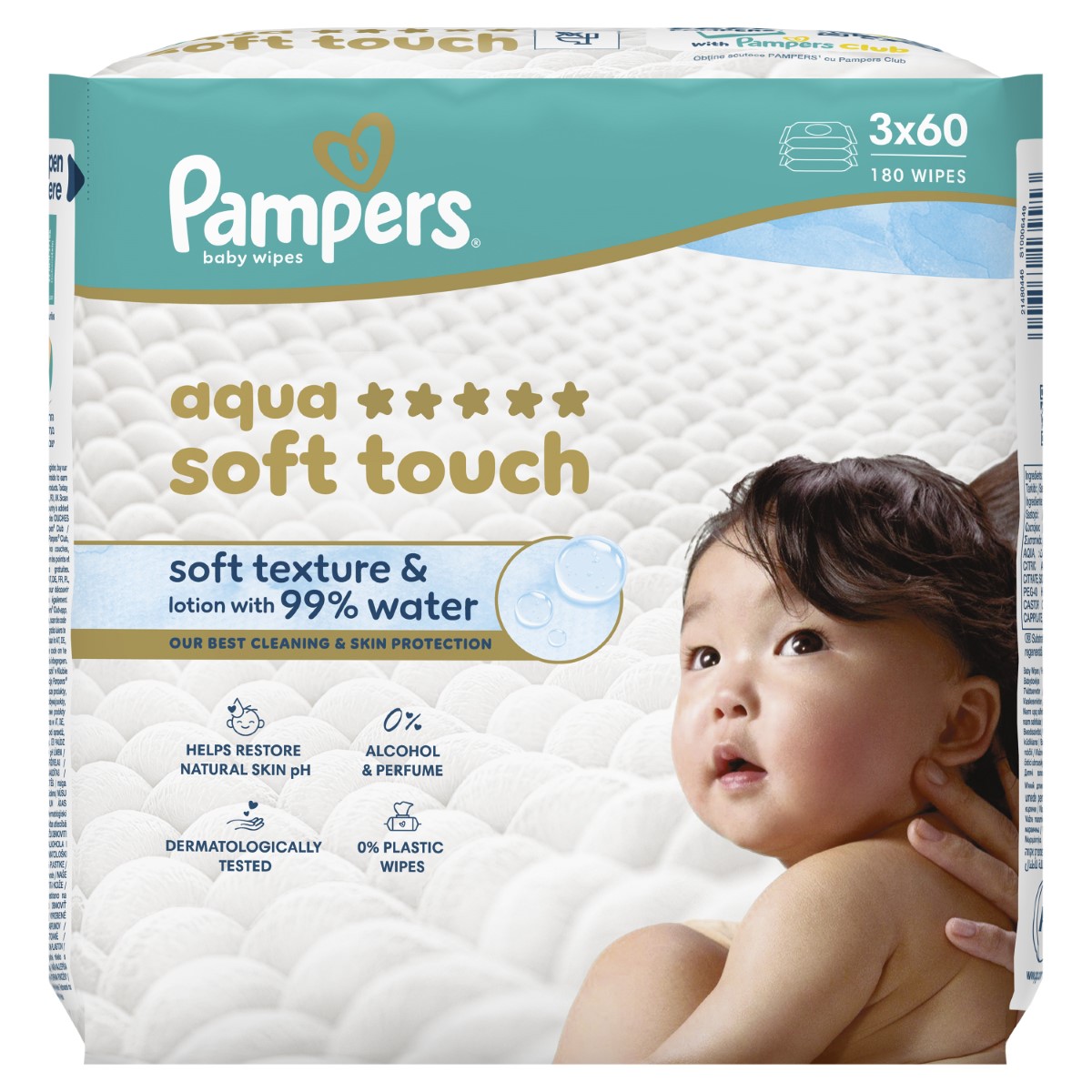 Dječje vlažne maramice Pampers Aqua Soft Touch – Pampersovo najbolje čišćenje i zaštita kože. Meke teksture i s losionom s 99 % vode, naše vlažne maramice nježno čiste i pomažu zaštititi osjetljivu bebinu kožu, zahvaljujući našoj posebnoj formuli koja pomaže obnoviti prirodni pH kože i štiti kožu od crvenila. Ove vlažne maramice sadrže 0 % alkohola i dodanih mirisa. Formula je dermatološki testirana. Odobrili su je dermatolozi udruženja Skin Health Alliance.