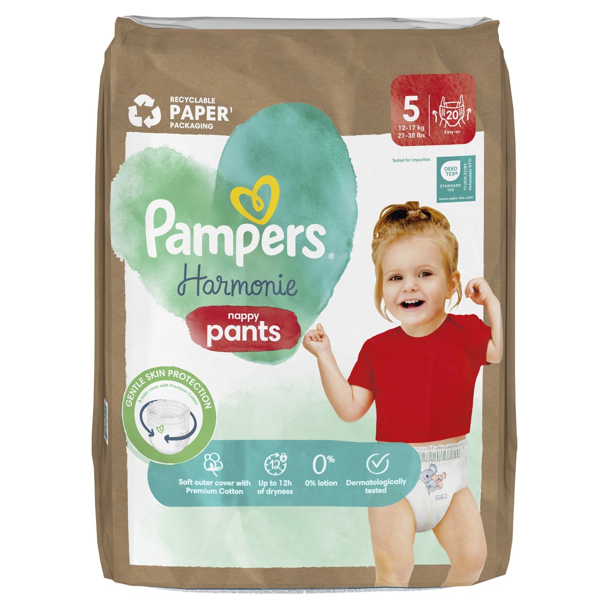 100% Pampersovo upijanje i mekani vanjski sloj s vrhunskim pamukom. Pelene-gaćice Pampers Harmonie izrađene su od pamuka vrhunske kvalitete (15% u vanjskom sloju), mekanih vlakana biljnog porijekla (50% u upijajućem površinskom sloju) i drugih pažljivo odabranih materijala. Hipoalergene su i dermatološki ispitane kako bi bile nježne za bebinu kožu. Sadrže 0% dodanih mirisa i losiona te jamče do 12 sati Pampersove suhoće, za pouzdanu kvalitetu koju svaki roditelj treba. Krase ih slatke ilustracije, a imaju i praktičan Pampersov indikator mokre pelene pa ćete ih i vi i vaša beba obožavati! Pelene Pampers Harmonie izrađene su od celuloze pribavljene iz odgovornih izvora i certificirane su prema normi Standard 100 udruženja Oeko-Tex, jednom od najzahtjevnijih svjetskih certifikata. U papirnatom pakiranju koje se može reciklirati.