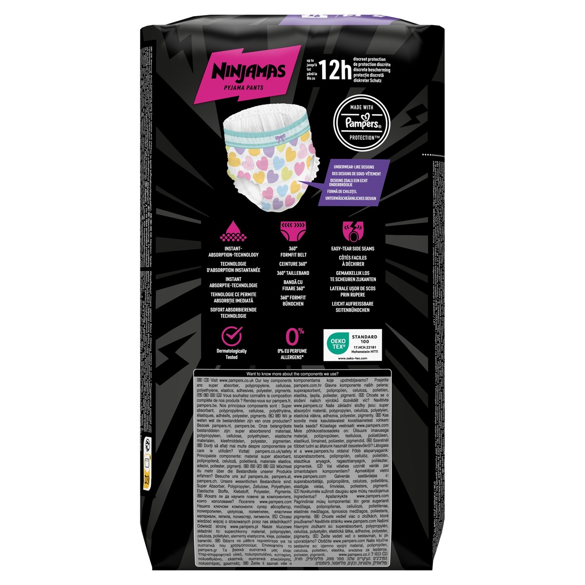 Pampers Ninjamas Pyjama Pants pelene-gaćice osmišljene su kako bi bile djetetov pomoćnik, pružajući 100 % zaštitu od curenja tijekom cijele noći. Pružaju sigurnu i diskretnu zaštitu kako bi djeca mogla sigurnije zaspati, probuditi se suha i biti spremna za novi dan! Ne sadrže parfemske alergene, dermatološki su testirane i certificirane od strane OEKO-TEX-a. Pampers Ninjamas pelene-gaćice koriste tehnologiju trenutne apsorpcije koja pruža do 12 sati diskretne zaštite. Također, izgledaju i pružaju osjećaj kao donje rublje, pružajući udobnost tijekom nošenja. 360° FormFit pojas je dizajniran za tjelesnu građu starije djece, osiguravajući pristajanje koje je diskretno i udobno. QuietCloth materijal koristi se kako bi smanjio zvuk šuškanja prilikom nošenja, a tehnologija trenutne apsorpcije trenutačno upija vlagu, pružajući cjelonoćnu zaštitu od curenja. Uz Pampers Ninjamas pelene-gaćice, možete prihvatiti nezgode s mokrenjem u krevet te se probuditi sigurni.