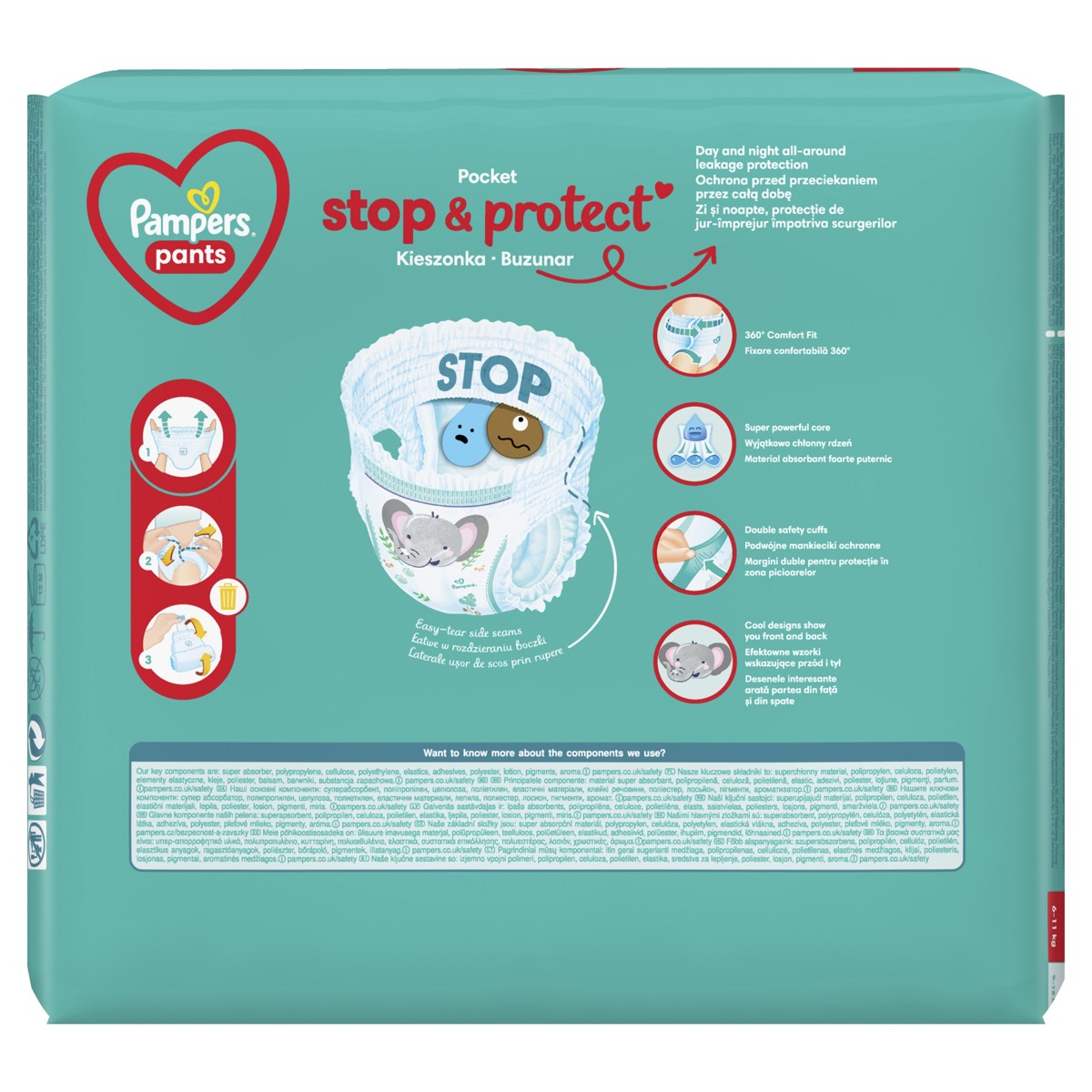 Pelene-gaćice Pampers Pants imaju revolucionarni džep STOP & PROTECT koji u kombinaciji s prianjanjem 360° Fit pruža do 12 sati zaštite od propuštanja sa svih strana. Imaju i iznimno upijajuću jezgru koja odmah upija vlažnost, a dvostruke trakice uz noge pomažu spriječiti propuštanje oko nogica.