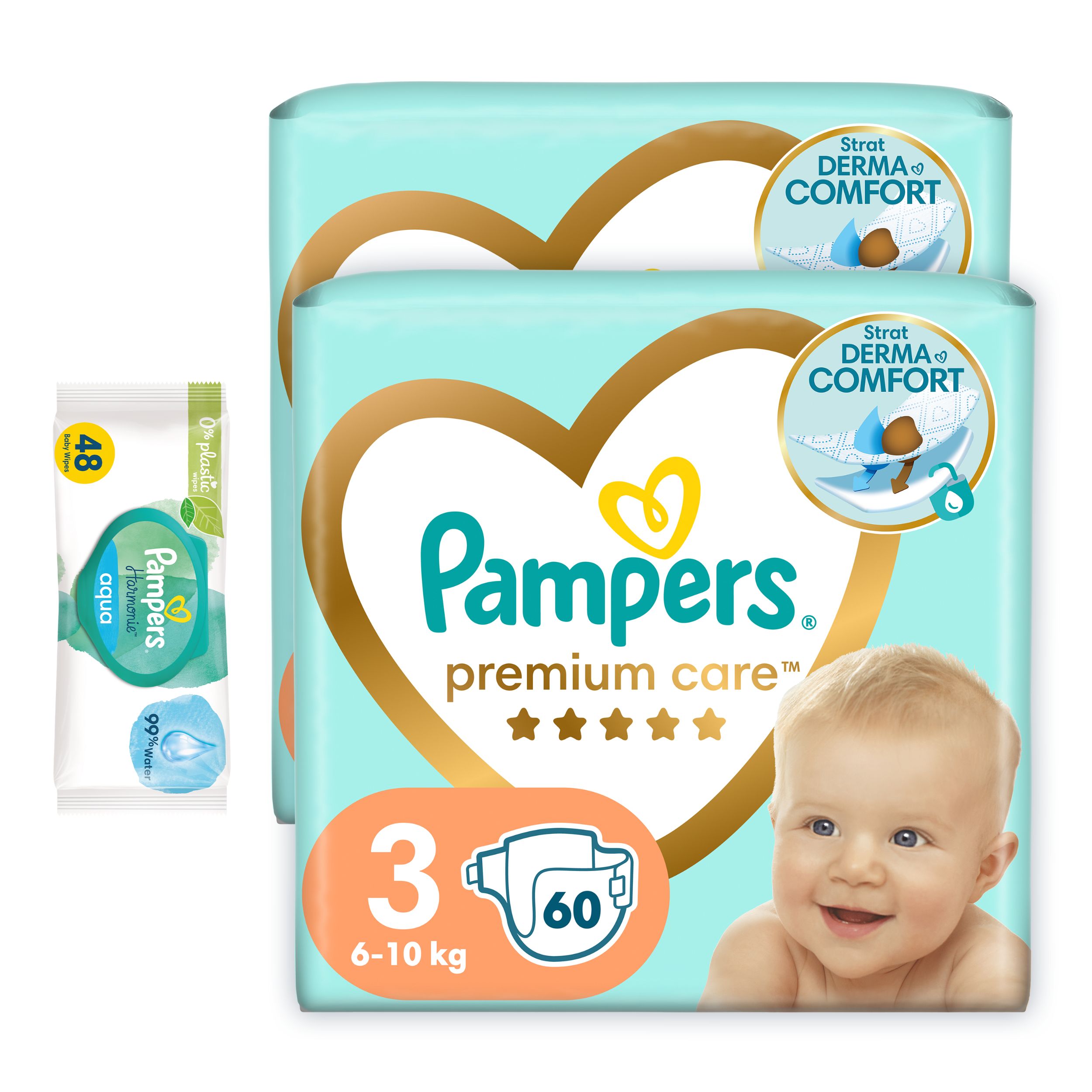 PAMPERS Premium Care, poklon paket, pelene duo pakiranje veličina 3 (6-10kg) 60kom + Harmonie Aqua vlažne maramice 48kom