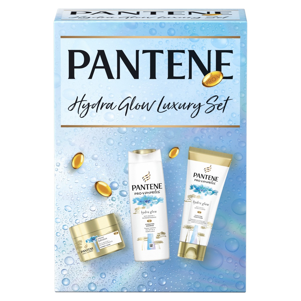 Otkrijte Pantene Hydra Box, darovni komplet pun Panteneovih proizvoda uz koje će čak i potpuno dehidrirana kosa ponovno zablistati. Hidratantni šampon Pantene Hydra Glow s biotinom i ekstraktom baobaba pruža njegu nakon koje čak i potpuno dehidrirana kosa ponovno blista. Hidratantni balzam Pantene Pro-V Miracles Hydra Glow ostavlja kosu laganom, hidratiziranom i sjajnom zahvaljujući kombinaciji legendarne formule s provitaminom B5, biotinom i ekstraktom baobaba, stabla iz afričke savane poznatog kao „drvo života”. Maska Pantene Pro-V Intense Hydration Surge Sorbet oživljava čak i kronično suhu kosu dubinskim tretmanom kojim svaka vlas dobiva potrebnu hidrataciju.