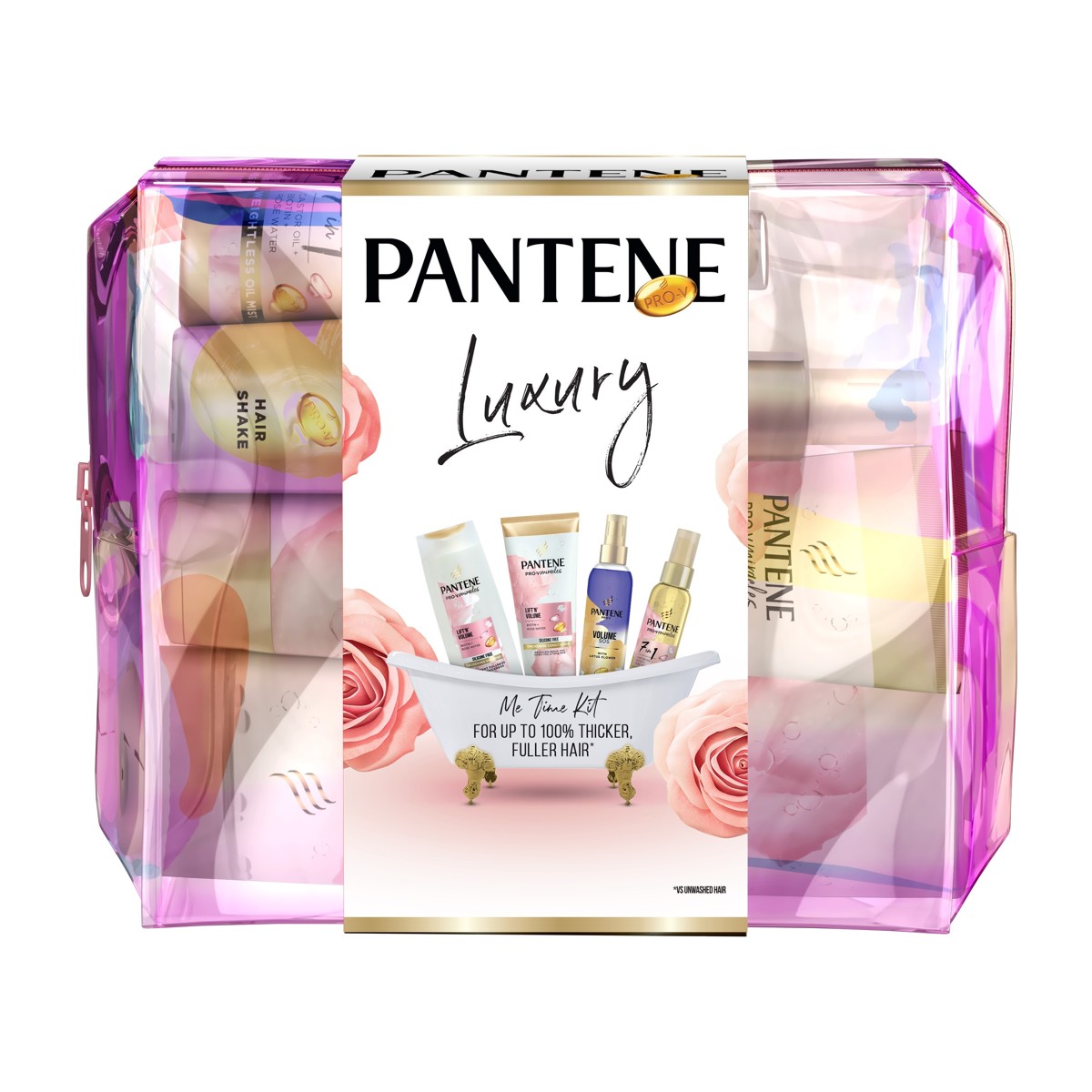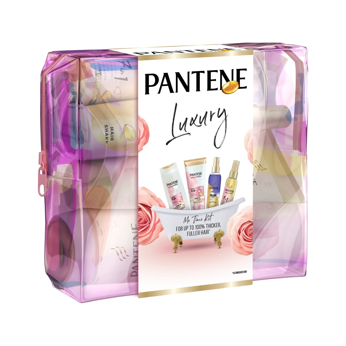 Želite li trenutak za opuštanje? Trenutak za sebe? Ili se možda netko od vaših bližnjih želi opustiti kućnim spa-tretmanom? Ova prekrasna luksuzna kozmetička torbica s najboljim proizvodima Pantene omogućit će vam da napokon odvojite #vrijemezasebe, a pritom dubinski transformirate svoju kosu i dodate joj volumen. Kolekcija Lift’n’Volume kombinira moć formule Pro-V s biotinom i ružinom vodicom. Šampon bez silikona i balzam opskrbljuju vašu kosu hranjivim tvarima i pomažu je zaštititi od oštećenja uzrokovanih oblikovanjem tako da možete imati vidljivo gušću i dužu kosu kakvu želite. Svojom jedinstvenom formulom s ricinusovim uljem, biotinom i ružinom vodicom ulje u maglici Pantene Pro-V Miracles 7 u 1 zaštitit će kosu od oštećenja uzrokovanih oblikovanjem i toplinom, poboljšati njezin sjaj i ukrotiti neposlušne pramenove, a SOS sprej za kosu bez ispiranja Pantene Pro-V odmah čini vašu kosu punijom i pomaže vam vratiti osjećaj svježe oblikovane kose.