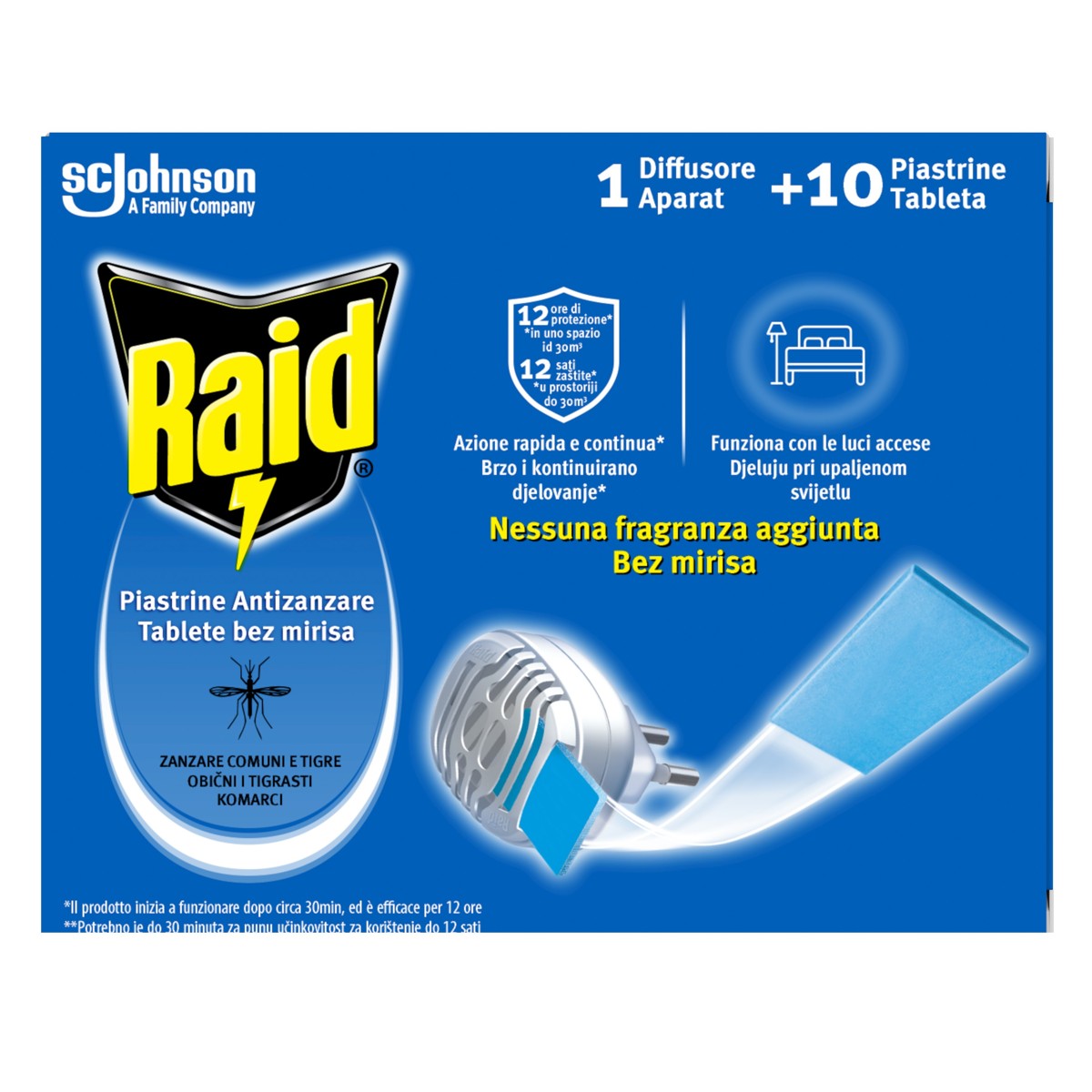 Raid® tablete bez mirisa pružaju učinkovitu zaštitu od običnih, tigrastih i tropskih komaraca, uključujući one koji prenose opasne bolesti poput denga groznice, chikungunya, Zika virusa i virusa žute groznice. Svaka tableta, korištena s električnim uređajem, štiti prostor do 30 m³ za 12 sati, pružajući vam sigurnost u zatvorenim prostorima s zatvorenim prozorima i vratima. Ovaj tihi uređaj s niskom potrošnjom energije troši manje od 5 W·h po satu, a pruža 10 noći zaštite, bez buke i svjetla. Idealan je za sigurno i diskretno korištenje u vašem domu.