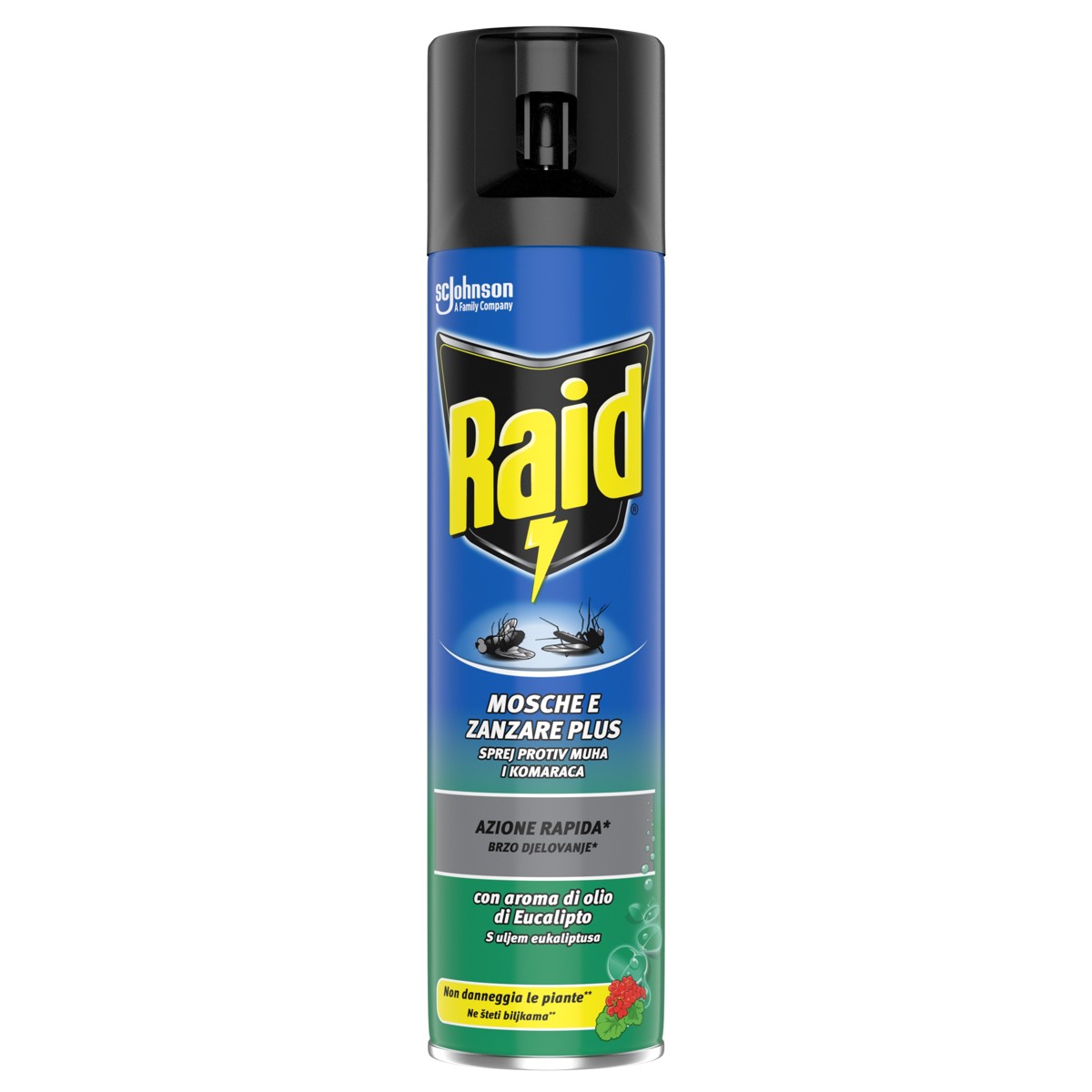 Raid® Sprej protiv muha i komaraca s mirisom eukaliptusa, zahvaljujući svojoj formuli, brzo ubija leteće insekte te pruža dugotrajnu zaštitu od muha i komaraca za vas i vašu obitelj.
