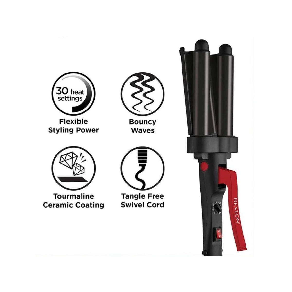 Stvorite duboke, raskošne valove koji traju od ranog jutra do kasne noći s trocijevnim turmalinskim keramičkim uređajem za valove Revlon Jumbo Waver. Uređaj Revlon Jumbo Waver ima jedinstven dizajn s tri valjka i posebno širok srednji valjak, kako bi stvorio prekrasne, glatke valove u stilu “beachy waves”. Valjci s tri sloja keramičkog premaza emitiraju dugovalno infracrveno zračenje za sjajne, glatke frizure koje su postojane cijeli dan.