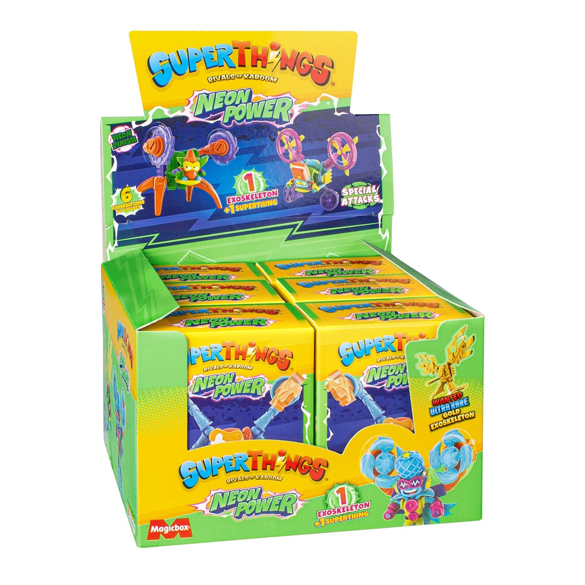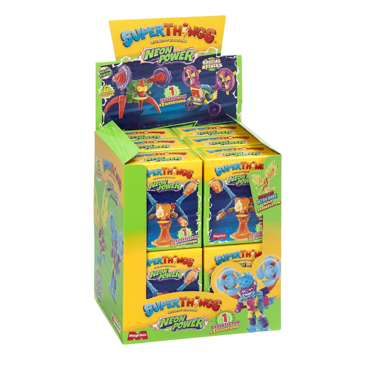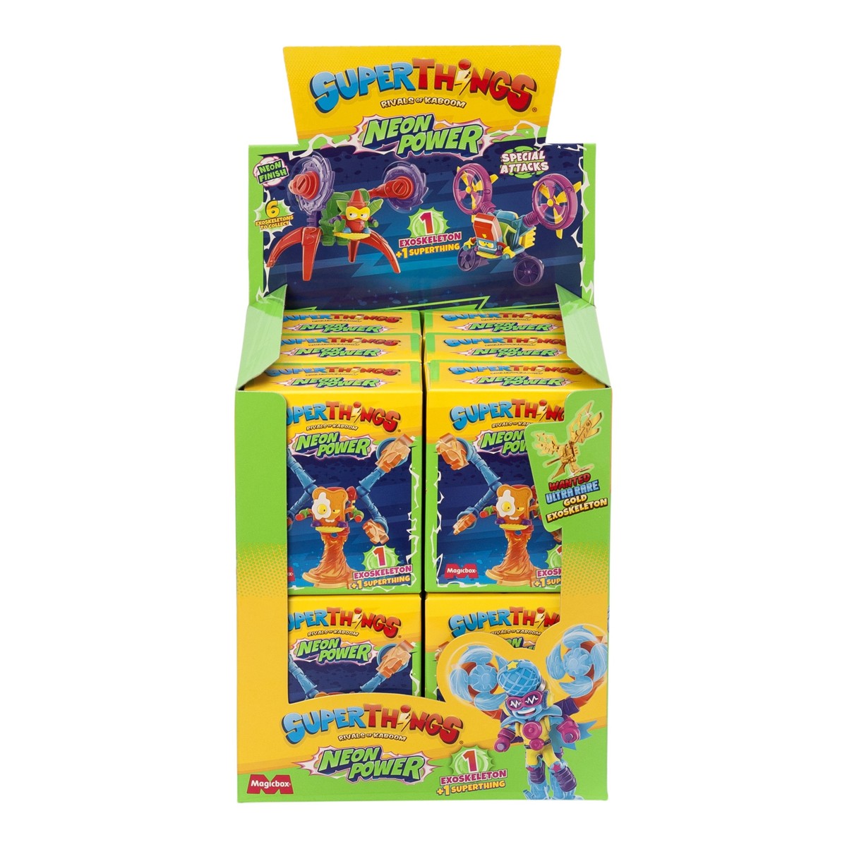 Predstavljamo Superthings egzoskeletone – naoružane figure s pokretnim rukama! Rezultat tehnoloških eksperimenata profesora K, prožeti su neonskom snagom ColorFlash-a i sada su još nezaustavljiviji. Heroji i zlikovci, SuperThings i Kazoom Kids udružili su se s njima ‒ i bitka će biti luđa nego ikada. Sakupi 6 modela i pronađi ultra rijetki zlatni egzoskelet!