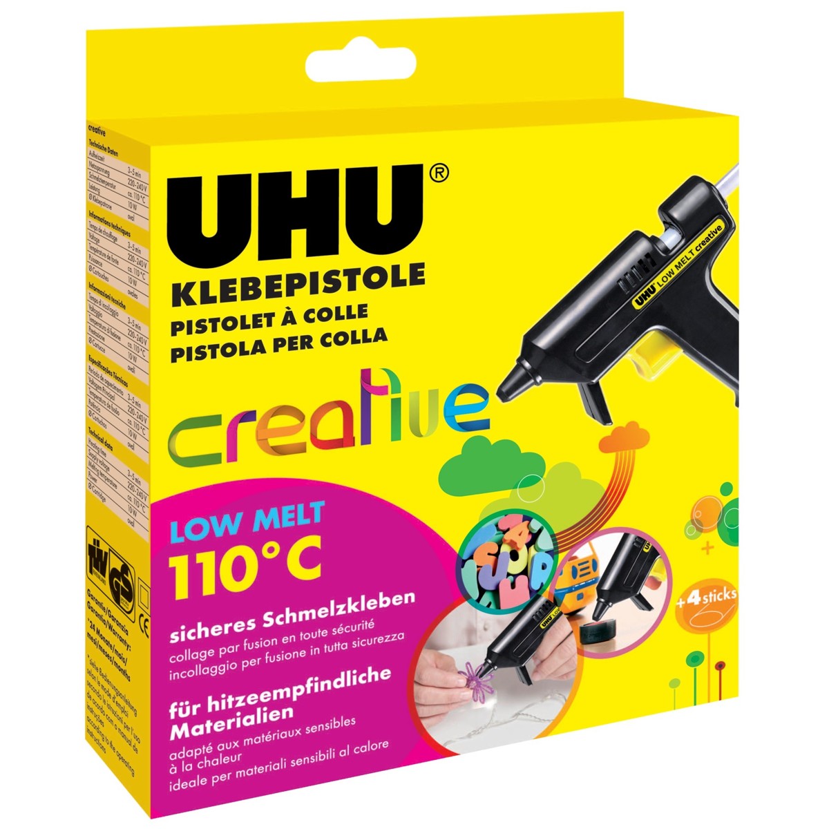 UHU pištolj LT110 je ljepljivi pištolj niske temperature. Radna temperatura je 110 ° C i stoga omogućava sigurno lijepljenje taline. To vam omogućuje brz i univerzalan rad. Čak se i materijali osjetljivi na toplinu, poput Styropor®, mogu zalijepiti.