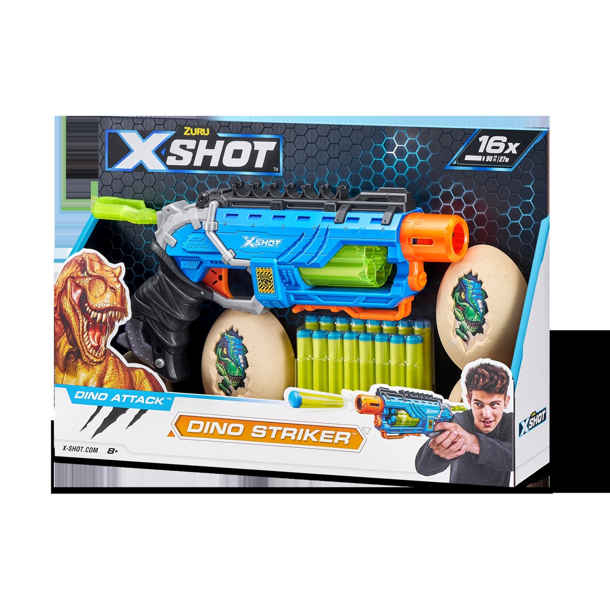X-Shot Dino Attack Striker je blaster sa 6 strelica i samorotirajućom cijevi.