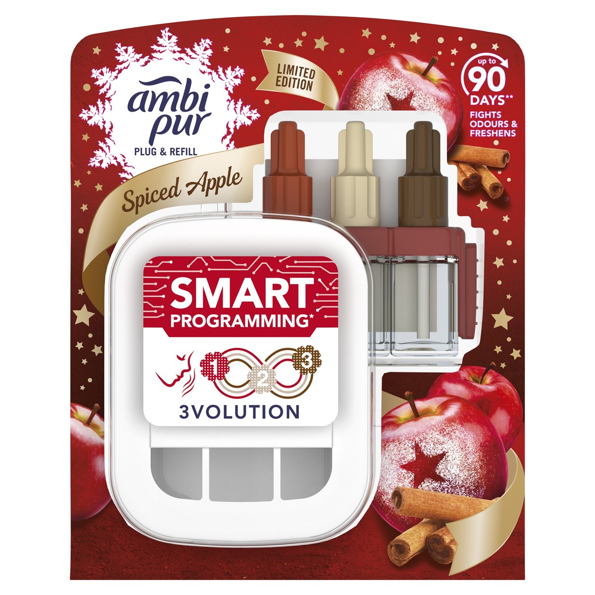 Ambi Pur 3Volution električni osvježivač s pametnim programiranjem Vanilla Cookie neprekidno se bori protiv neugodnih mirisa i izmjenjuje 3 komplementarna mirisa za svježinu koju ćete stalno primjećivati. Traje do 90 dana (ako se upotrebljava 12 sati dnevno na minimalnoj postavci). Otkrijte ljepotu varijante Spiced Apple, sada s digitalnom kontrolom izmjene mirisa. Svjež miris koji dopire još dalje kako bi cijelu prostoriju ispunio mirisom. Gornje svježe, voćne note jabuke i bazge s blagim naznakama tradicionalnih zimskih začina (cimet, muškatni oraščić, klinčić) i vanilije. Opustite se i smirite dok ovaj čist i nježan miris ispunjava zrak. Uz uobičajene električne osvježivače zraka jako se brzo naviknemo na mirise, što znači da ih s vremenom prestajemo primjećivati. Ambi Pur 3Volution rješavaju taj problem neprekidnim izmjenjivanjem 3 izuzetno kvalitetna i komplementarna mirisa svakih 45 minuta. Zamjenjive uloške Ambi Pur 3Volution upotrebljavajte s električnim difuzorom 3Volution i ispunite svoj dom svježinom i mirisom koje ćete primjećivati dan za danom, tjedan za tjednom. 3Volution također omogućuje podešavanje razine oslobađanja mirisa i tako vam pomaže da stvorite atmosferu kakvu želite, kad želite.