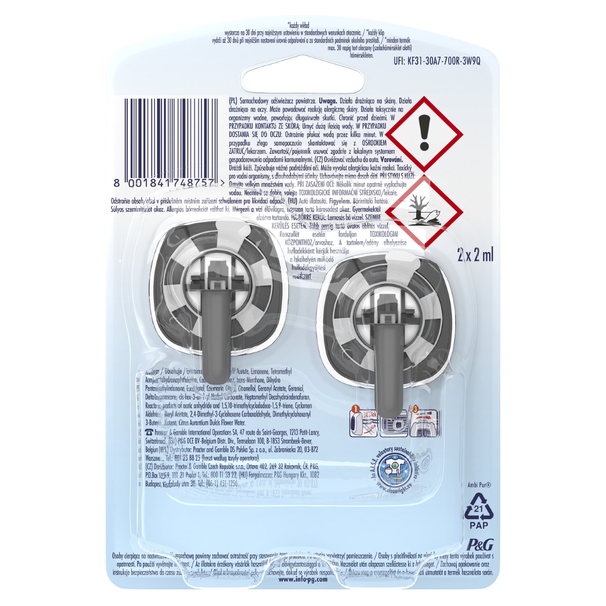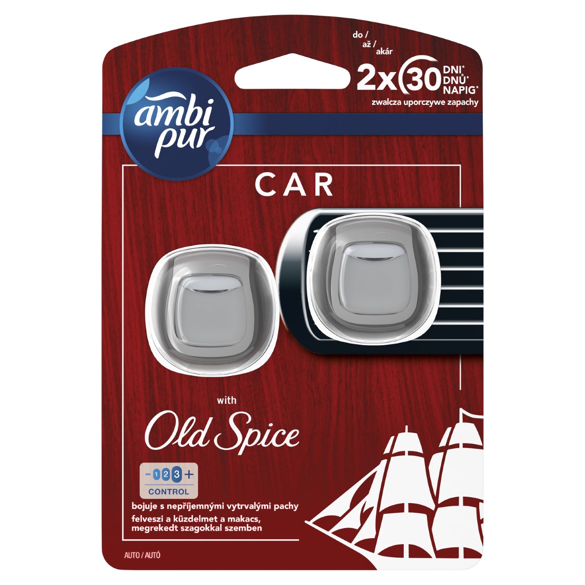 Neka tvoj automobil uvijek miriše jednako dobro kao i ti. Dva osvježivača Ambi Pur Old Spice s laganim notama citrusa i metvice odišu svježinom i muževnošću. Njegova tehnologija Odourclear ne maskira neugodne mirise već ih uistinu uklanja, čak i one najupornije poput mirisa hrane, kućnih ljubimaca, dima ili otpada, a ostavlja blag, svjež miris, koji traje i do 30 dana. Osvježivač Ambi Pur ne treba baterije ni električnu struju, malen je i diskretan te se lako postavlja na ventilacijski otvor u automobilu, a intenzitet mirisa regulirate uz pomoć kotačića.