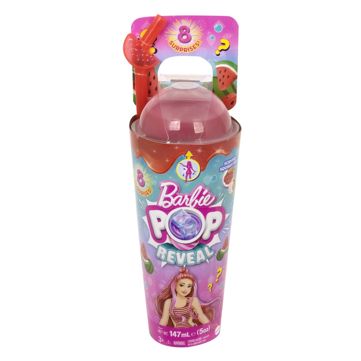 Nova Barbie Pop Reveal lutka pruža jedinstvenu zabavu raspakiravanja kombinirajući iznenađenja, slime i igru s lutkom. Prvo odmotaj čašu, a onda pomoću slamke slobodi slime iz poklopca. Slime će prekriti kockice leda u kojima se skrivaju razna iznenađenja. Uz kockice leda skrivena je i mirisna Barbie lutka. Svaka lutka dolazi s 8 iznenađenja, uključujući 2 promjene boje uz pomoć tople i hladne vode. A poseban dodatak je Barbien mali kućni ljubimac.