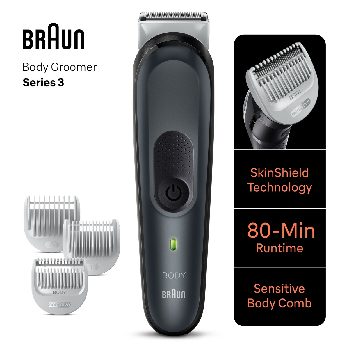 Braun Body Groomer 3340, za nježno uređivanje dlačica na cijelom tijelu, čak i na osjetljivim područjima. Brzo uklanjanje dlačica od prsa i pazuha do nogu i prepona. Ugodnost osiguravaju tehnologija SkinShield i češljić za osjetljiva područja. Uz pomoć kliznih češljića možete dobiti različite duljine. Ima dugovječne oštre oštrice, lako se čisti pod vodom i pruža 80 minuta bežičnog rada.