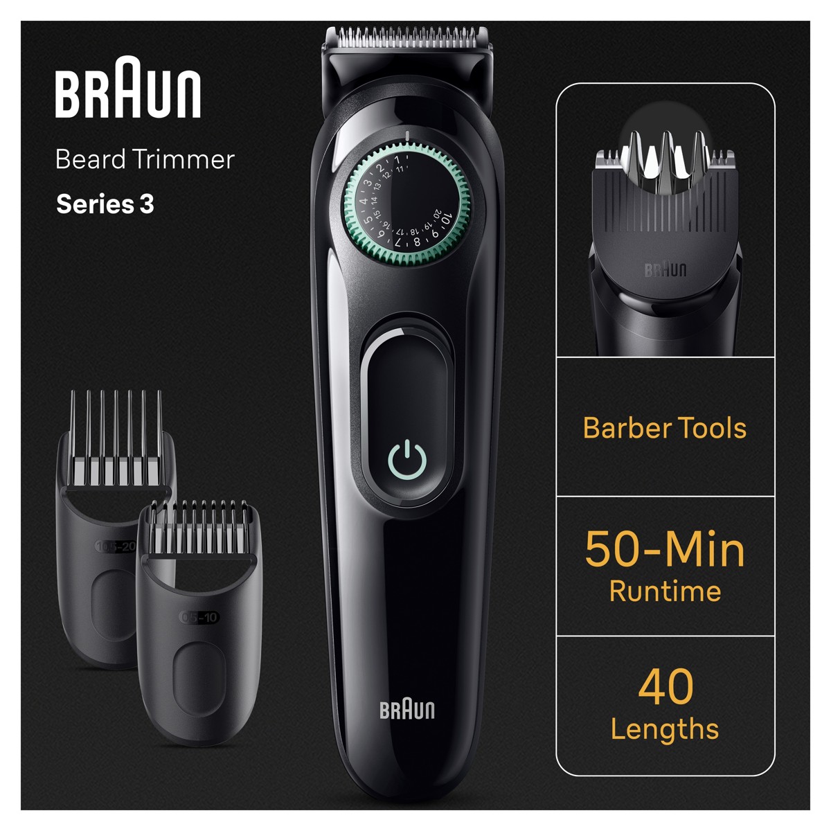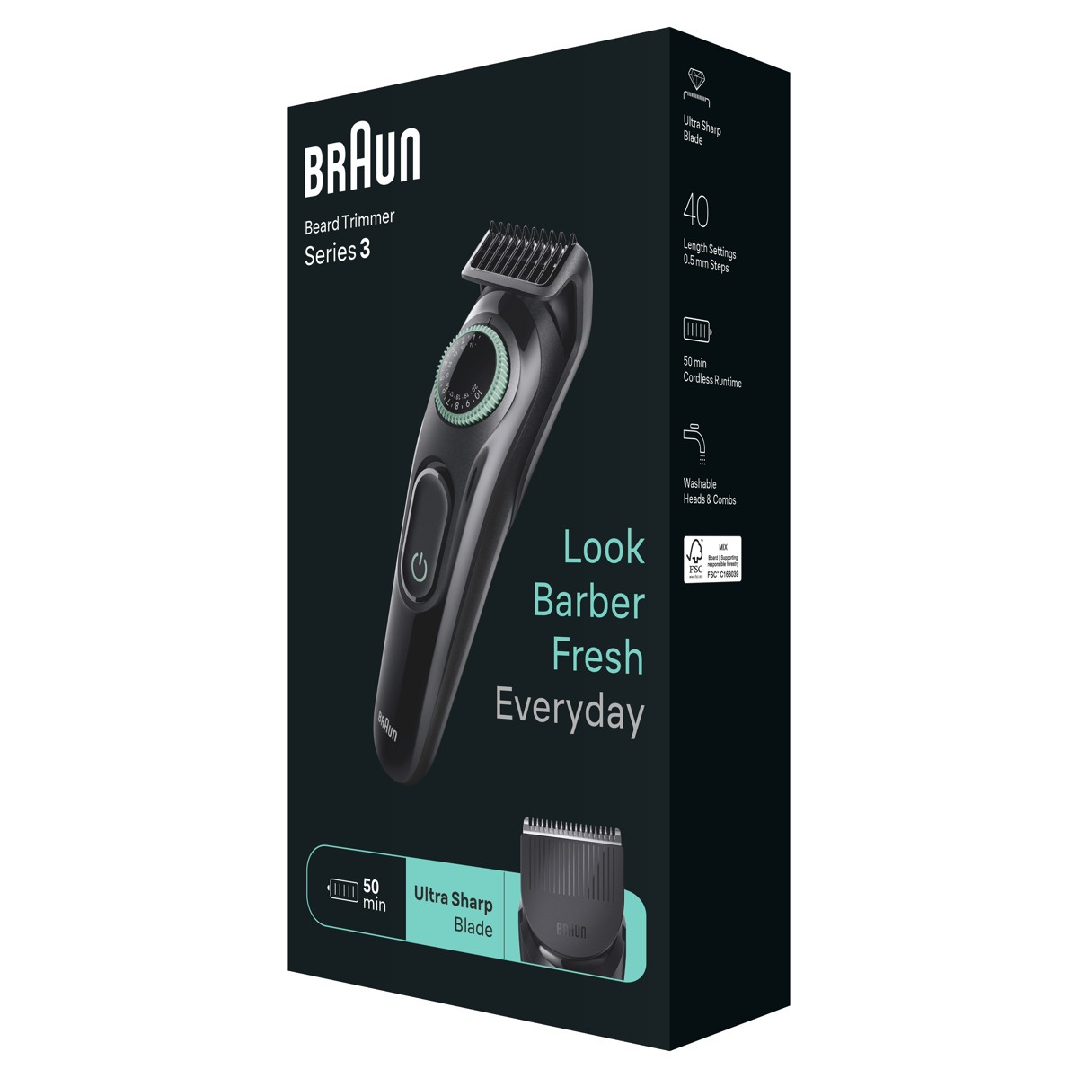 Izgledajte kao da ste upravo došli od brijača bez da izađete iz kuće uz Braunov trimer za bradu Series 3. Precizan je pri svakom potezu s izuzetno oštrim oštricama koje osiguravaju ravnomjerno podrezivanje najrazličitijih brada. Ima i kotačić za precizno podešavanje na 40 postavki duljine te bateriju za 50 minuta bežičnog rada.