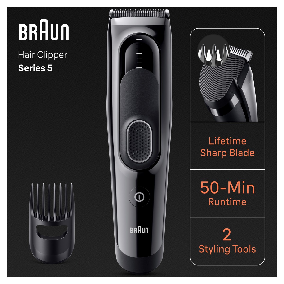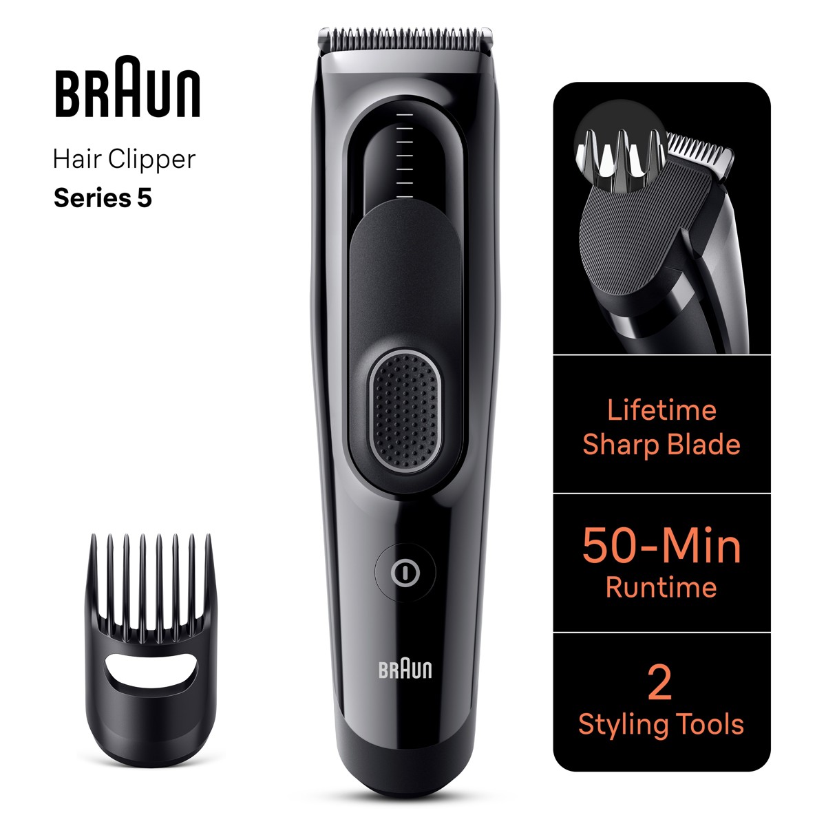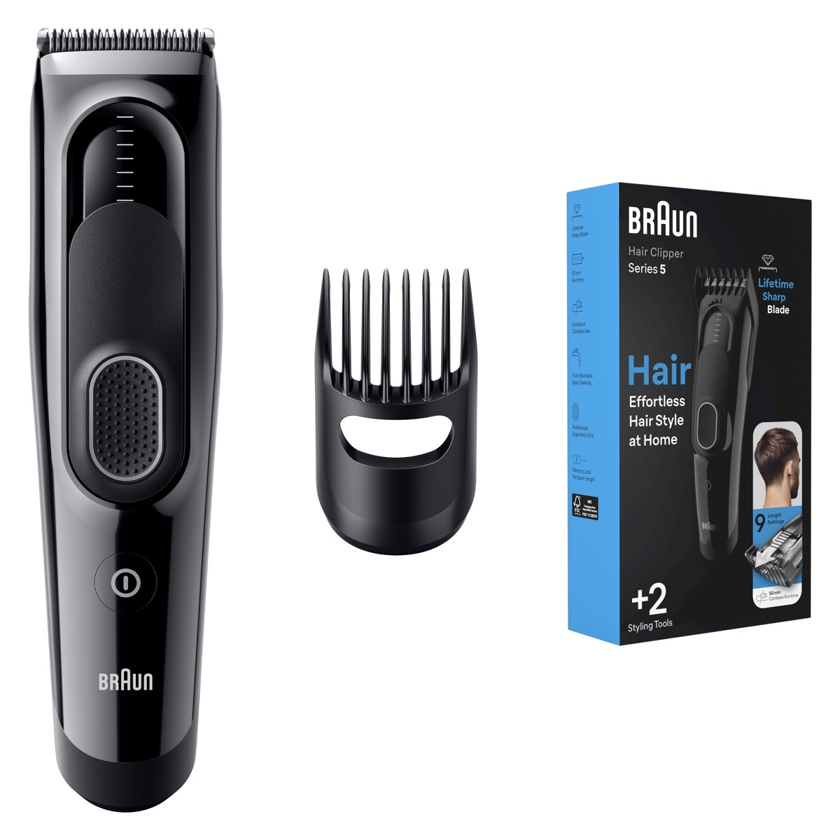 Lako do željene frizure u udobnosti doma uz aparat za šišanje Braun Hair Clippers Series 5. Izuzetno oštre oštrice čine podrezivanje jednostavnim bez obzira na duljinu i gustoću. S 1 češljićem i 9 postavki duljine te zaključavanjem Memory SafetyLock koje pamti zadnju korištenu postavku. Uređaj ima Ni-MH bateriju za 50 minuta rada i periv je pod vodom. Odličan poklon za svakog muškarca.