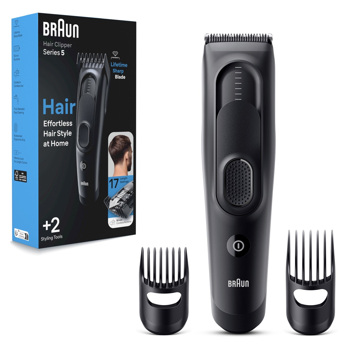 Lako do željene frizure u udobnosti doma uz aparat za šišanje Braun Hair Clippers Series 5. Izuzetno oštre oštrice čine podrezivanje jednostavnim bez obzira na duljinu i gustoću. S 2 češljića i 17 postavki duljine te zaključavanjem Memory SafetyLock koje pamti zadnju korištenu postavku. Uređaj ima Ni-MH bateriju za 50 minuta rada i periv je pod vodom. Odličan poklon za svakog muškarca.