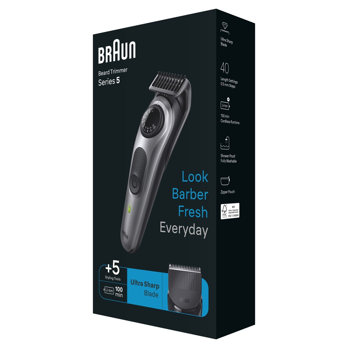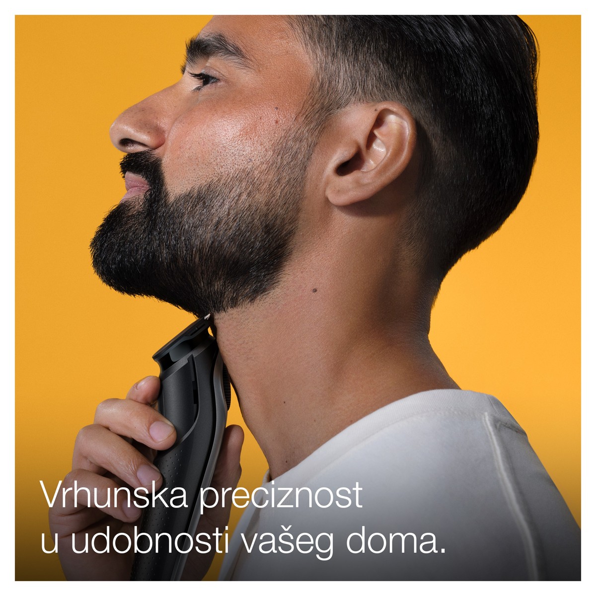 Izgledajte kao da ste upravo došli od brijača bez da izađete iz kuće uz Braunov trimer za bradu Series 5. Precizan je pri svakom potezu s izuzetno oštrim oštricama koje osiguravaju ravnomjerno podrezivanje najrazličitijih brada, kotačićem za precizno podešavanje na 40 postavki duljine i baterijom koja pruža 100 minuta bežičnog rada.