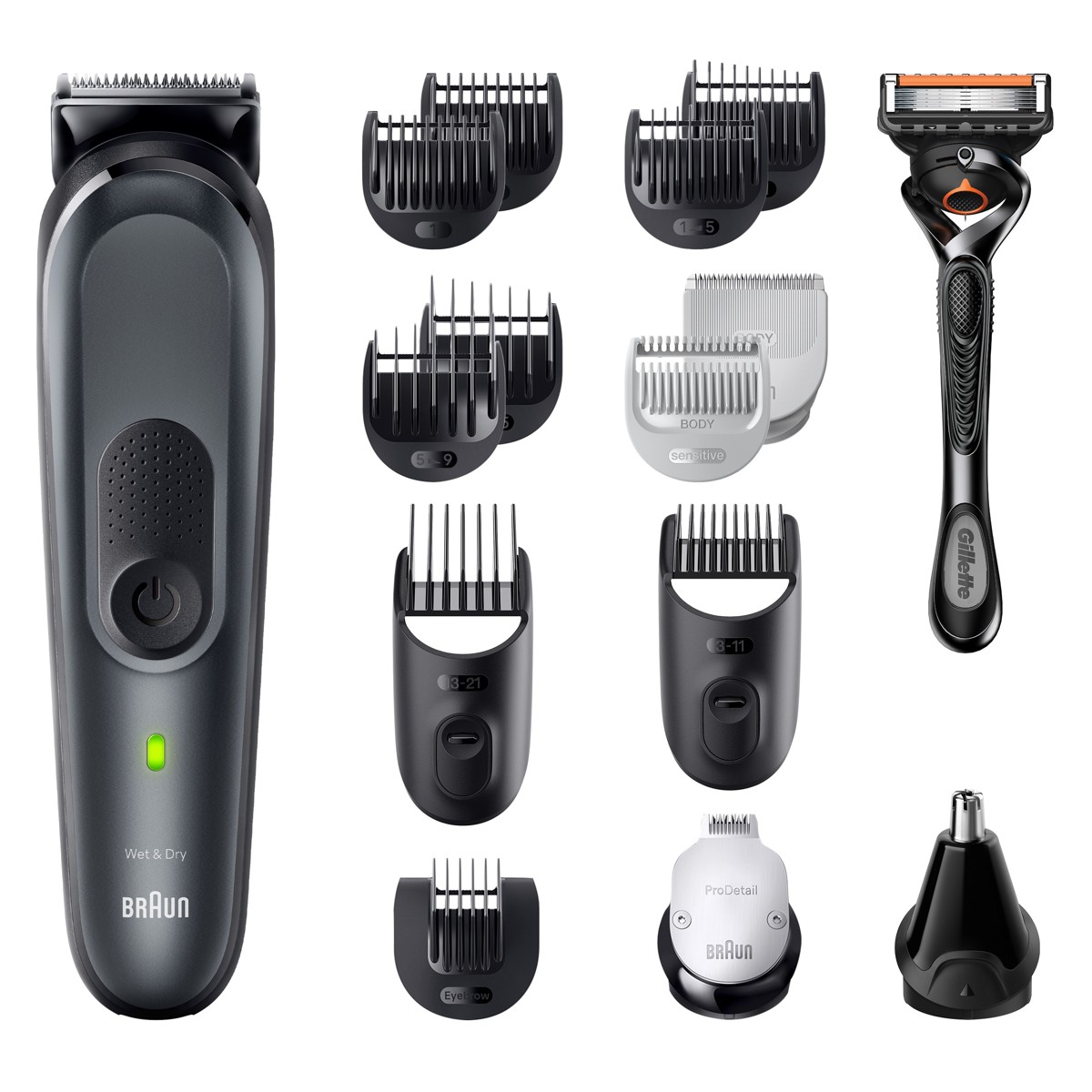 Uključuje: glavu trimera ProBlade, glavu trimera s brijačem za tijelo, glavu s trimerom za dlačice u ušima i nosu, glavu s trimerom za detalje, klizne češljiće za bradu (3 – 11 mm) i kosu (13 – 21 mm), standardne fiksirane češljiće (1-mm i 2-mm), češljić za osjetljiva područja, češljić za obrve, češljiće za stanjivanje brade i kose, brijač sa zamjenjskom britvicom Gillette Proglide, postolje za punjenje i etui za spremanje uređaja i nastavaka.