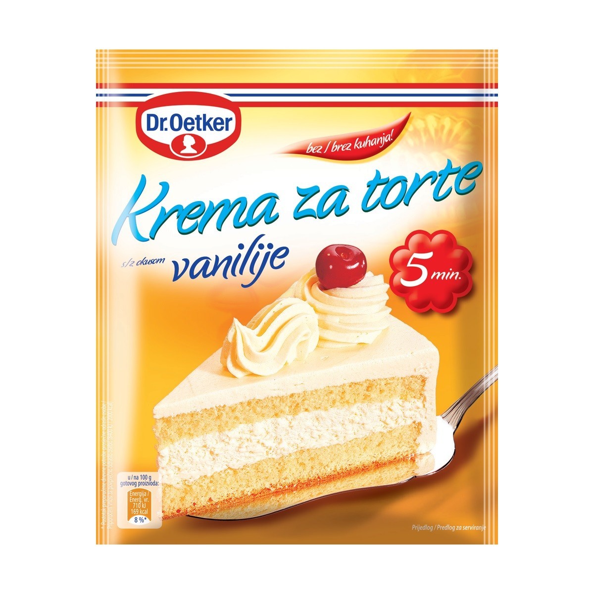 Dr. Oetker Krema za torte s omiljenim okusom vanilije brzo i jednostavno se priprema. Praktična je jer se može čuvati kod kuće u zalihi, a priprema se samo dodavanjem hladnog mlijeka. Dr. Oetker Kremu za torte s okusom vanilije možete koristiti kao nadjev ili kao ukras torti, kolača, princes krafni i sličnih slastica.