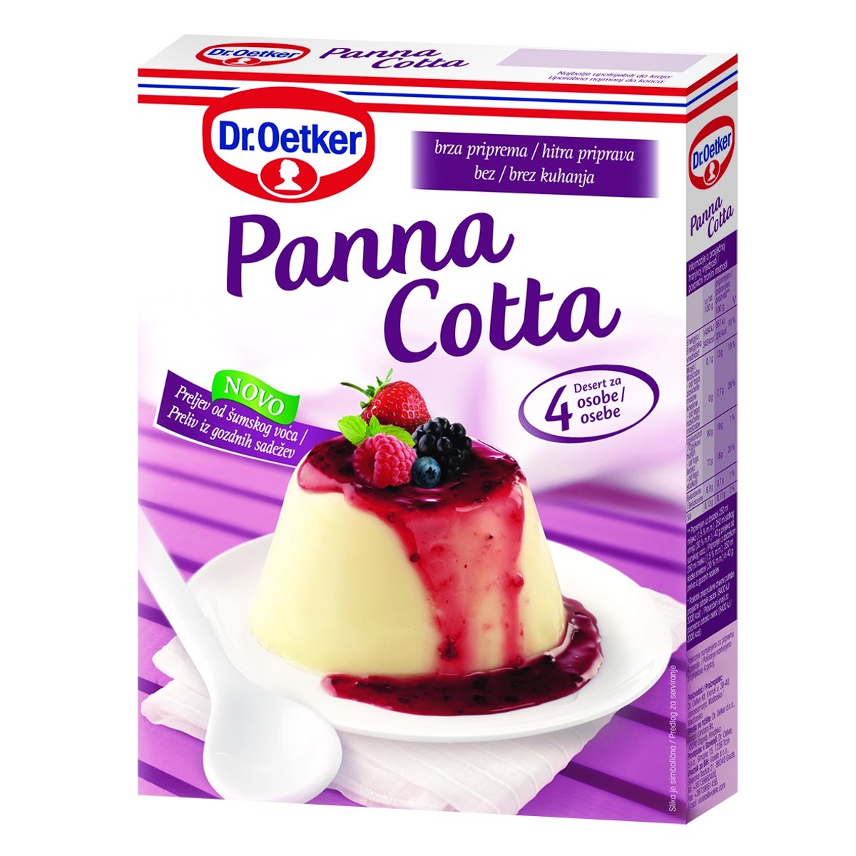 Dr. Oetker Panna Cotta priprema se prema originalnoj talijanskoj recepturi sasvim jednostavno, bez kuhanja! Pomiješa se s mlijekom i slatkim vrhnjem, stavi da se ohladi i uživanje u pravom talijanskom okusu, u vlastitom domu, može početi. Nemojte zaboraviti i ukusan preljev od šumskog voća koji će obogatiti svaki zalogaj. Razmazite sebe, svoju obitelj i goste ovim desertnim specijalitetom.