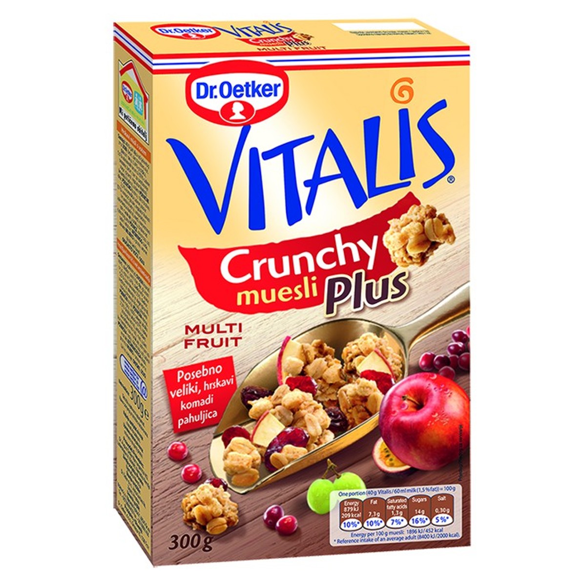 U Vitalis Crunchy Plus Multi-Voće zlatno-smeđe pržene, hrskave pahuljice spajaju se s posebnom voćnom kompozicijom  od brusnica, grožđica, jabuka i marakuje u posebno voćni hrskavi doživljaj. Vaš Plus za užitak u Vitalis Crunchy Plus: posebno puno voća: s brusnicama, grožđicama, jabukama i marakujom i zlatno-smeđi prženi hrskavi komadići s 46% integralnih žitarica – zahvaljujući posebnom postupku prženja posebno su hrskavi i ukusni