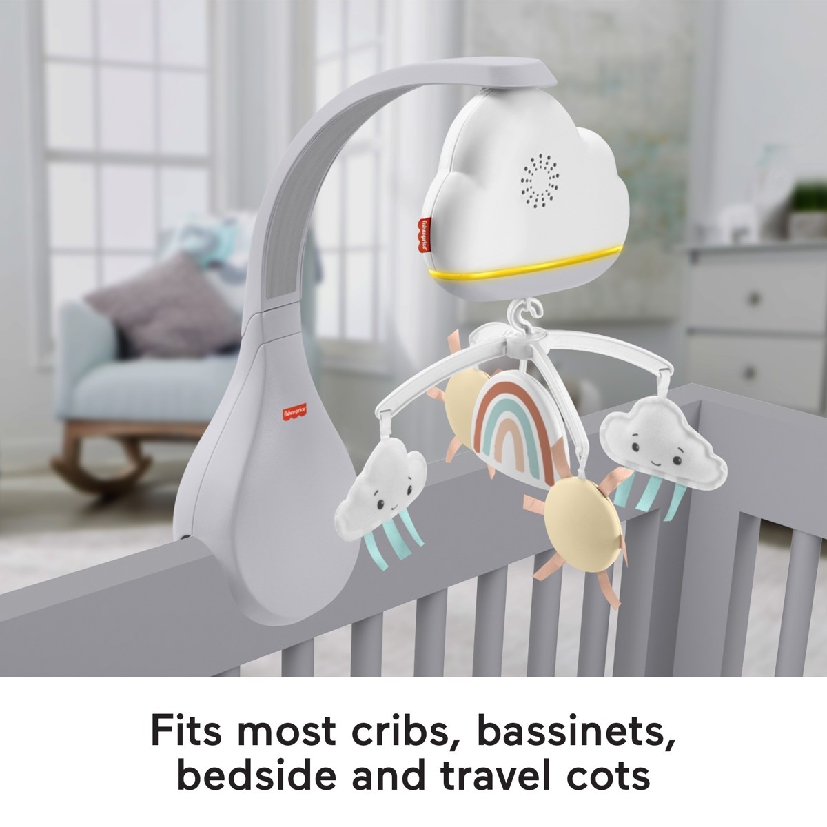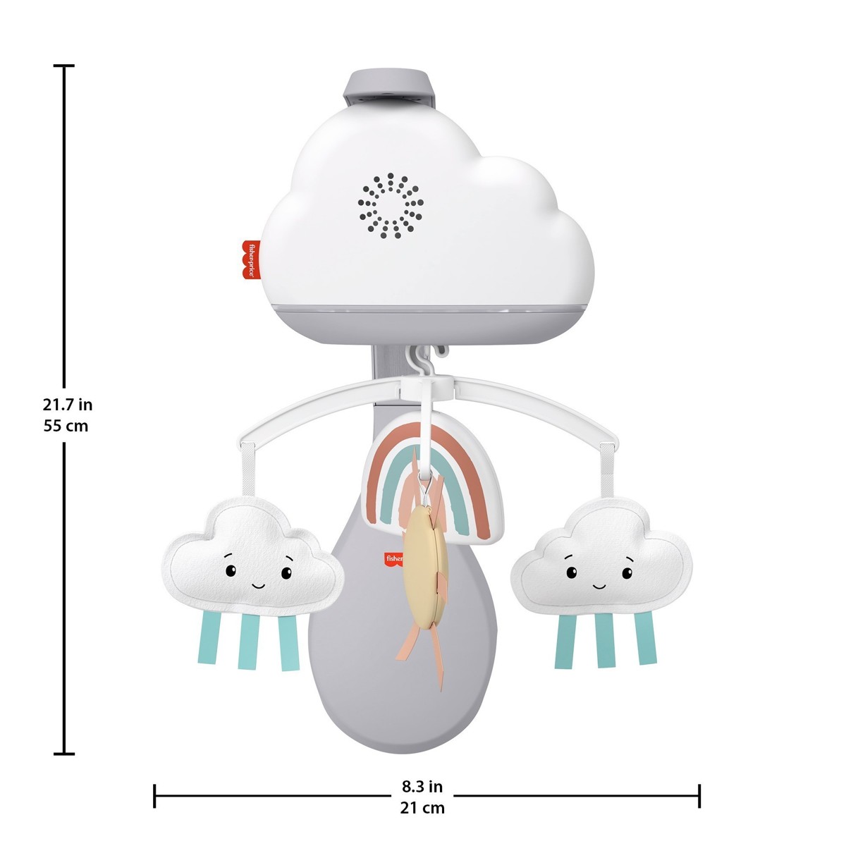 Fisher-Price vrtuljak s oblacima i suncem ima 20-minutnu listu glazbe i zvukova koji će vašem novorođenčetu pomoći da se opusti i utone u san.